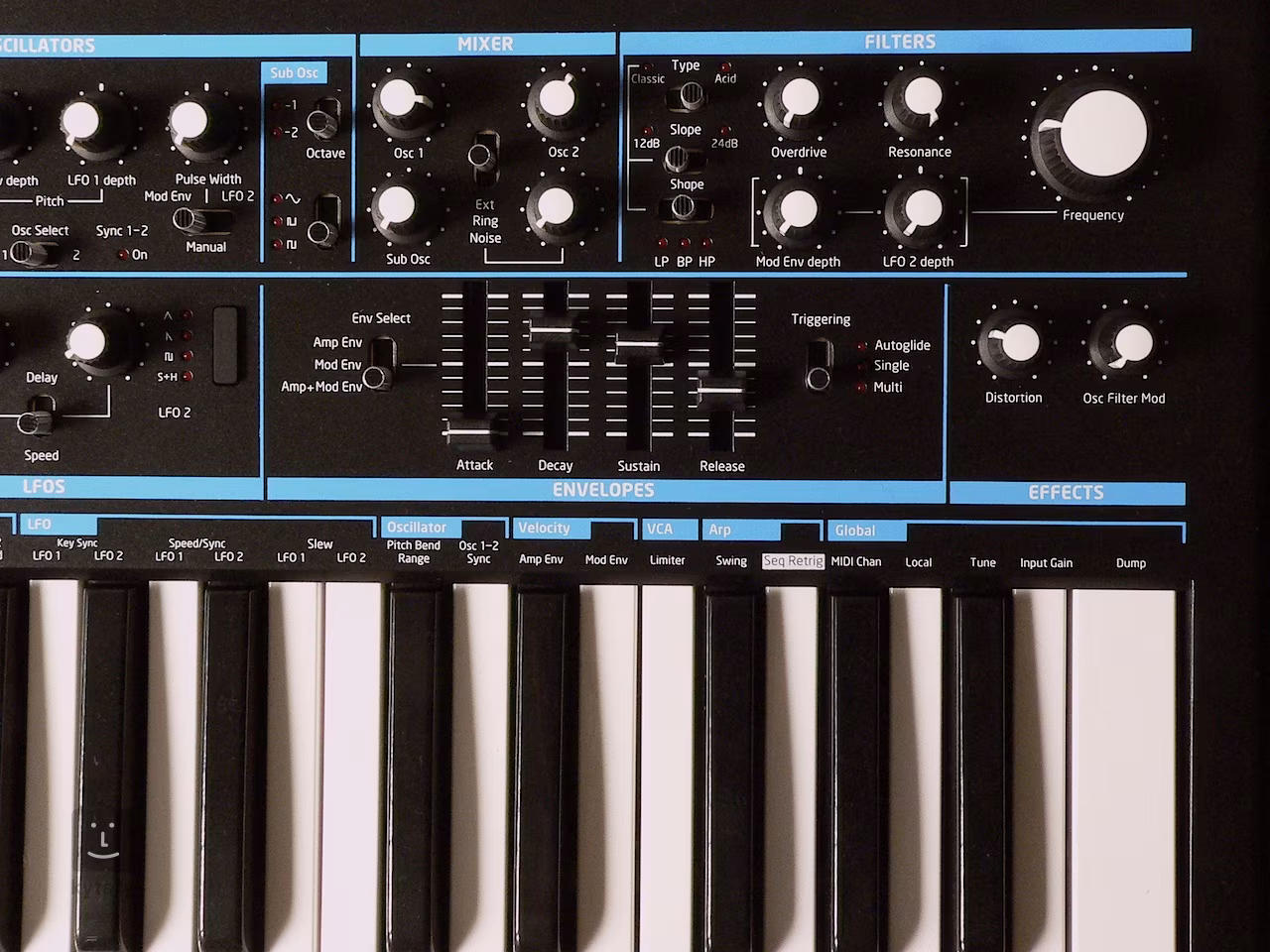 Két hangolható analóg oszcillátor szinkronizálási lehetőséggel és négy hullámforma közül választható, szuboszcillátor, zajgenerátor és gyűrűmoduláció.