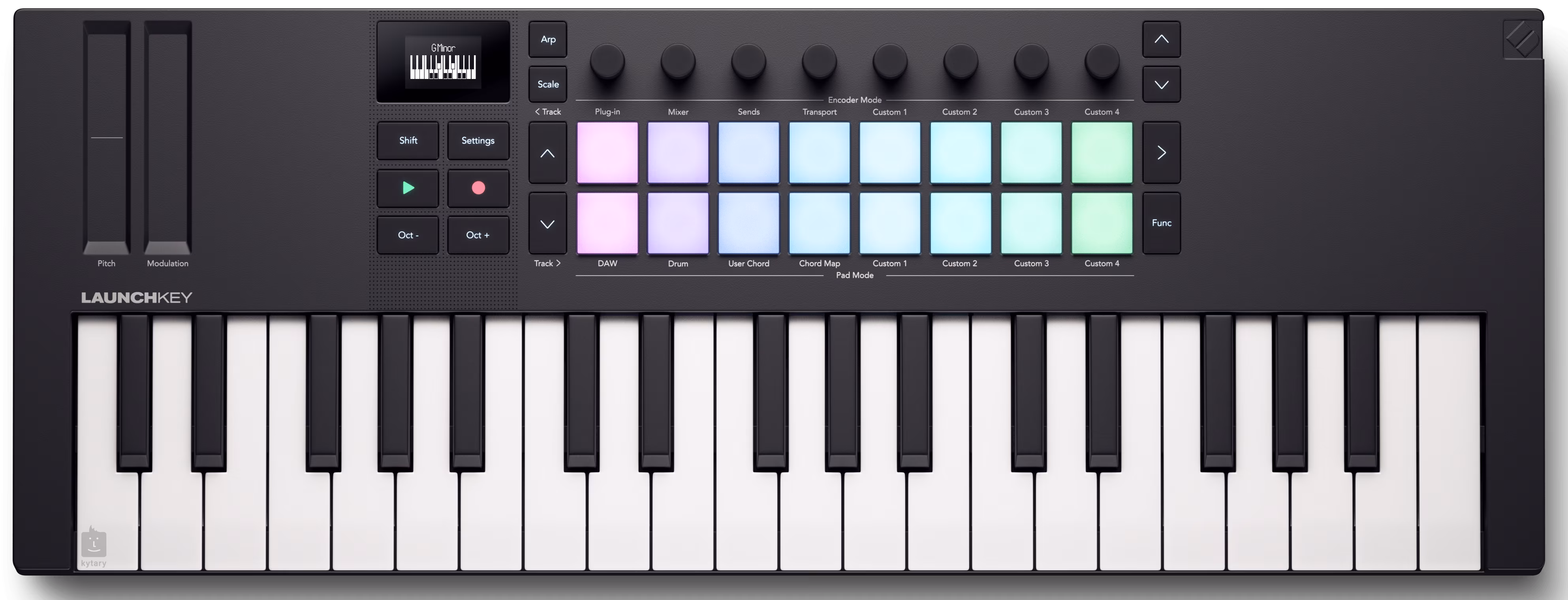 A Novation Launchkey Mini 37 egy nagy teljesítményű DAW-vezérlő szintetizátor típusú mini billentyűzettel, nyolc folyamatos kódolóval és 16 nyomásérzékeny paddal az ujjas doboláshoz és klipek triggereléséhez. A kontroller kreatív akkord és skála módokkal is rendelkezik, amelyek az OLED kijelzővel együttműködve megkönnyítik a dallamban maradást.