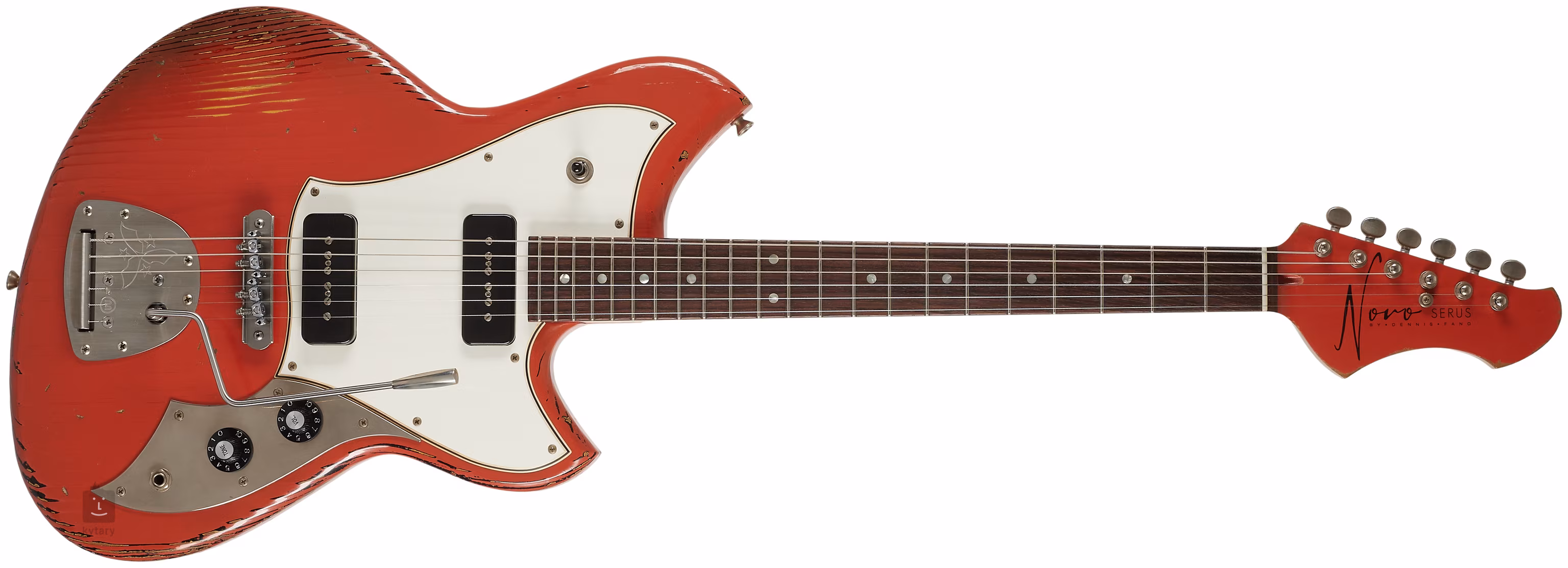 Ez egy fenyőtestű, offset kialakítású elektromos gitár a Serus modellek sorozatából, amelyet egy kis csapat tapasztalt gitárkészítő készített amerikai műhelyekben. A testet Fiesta Red over 64 3-Tone Burst díszíti, ahol a vörös lakk alatt átsejlik az alapszín, a 3-Tone Sunburst, antikolt felület (medium distress) és stílusos világos pickguard. A kényelmes Medium C profilú juharfához paliszander fogólap van ragasztva, amelyen huszonkét pakfong/nikkel-ezüst (.047″x.095″) fekvő van. A test vintage megjelenéséhez illeszkedik a nyak kinézete is, amely hőkezeléssel nyerte el a megérkezett faanyagok báját és érzetét. A fogólap kombinált sugara kényelmes akkordjátékot biztosít a nulladik fekvésnél, valamint kényelmes játékot és hangok kiemelését a fogólap magasabb pozícióiban.