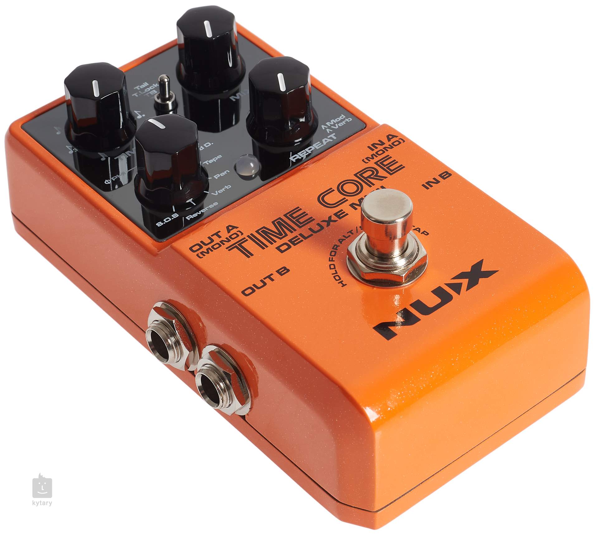 A NUX TIME CORE DELUXE MKII egy sztereó/mono delay pedál, amely hétféle delay effektust kínál. Nevezetesen Phi Digital Delay - digitális késleltetés (késleltetési idő: 80 ms - 1000 ms), Analog Delay (40 ms - 403 ms), Modulation Delay - digitális késleltetés + kórus (20 ms - 1500 ms), Tape Echo - szalagos visszhang szimuláció (55 ms - 552 ms), Pan Delay (80 ms - 1000 ms), Verb Delay - digitális késleltetés + plate reverb(80 ms -1000 ms) és Reverse Delay (320 ms -1240 ms). A fennmaradó szabályozók határozzák meg a késleltetési időt, a száraz/nedves jel arányát és az ismétlések számát. Alt módban a Repeat vezérlővel az effekt modulációs vagy reverb paraméterei változtathatók.