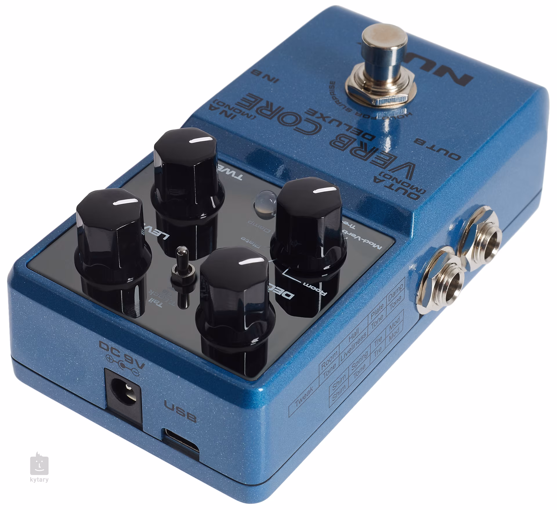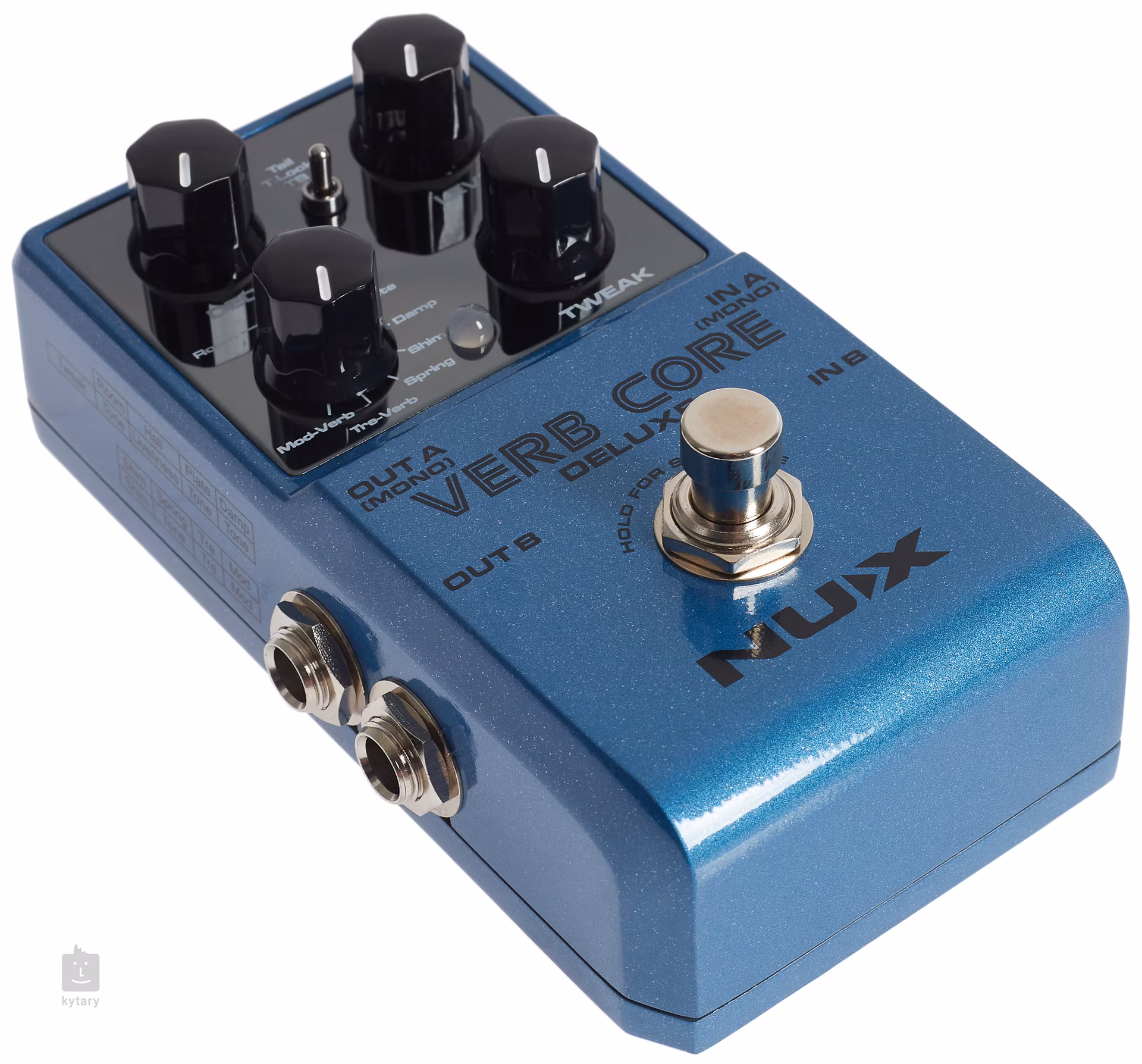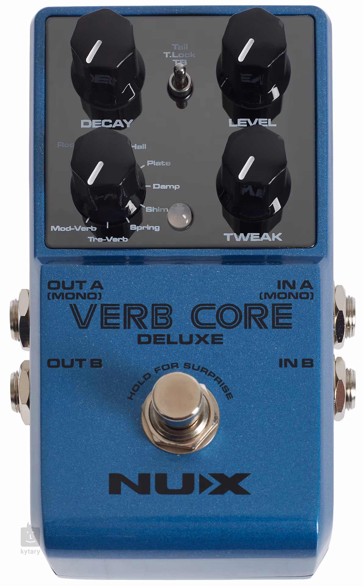 A NUX TIME CORE DELUXE MKII egy sztereó/mono reverb nyolc reverb effekt típussal (Room, Hall, Plate, Damp, Shim, Spring, Tre-Verb, Mod-Verb), amelyek között a Reverb Type gombbal választhat. A többi gomb határozza meg a reverb hosszát és a száraz/nedves jel arányát. A Tweak szabályozó funkciója a kiválasztott effekt típusától függően változik.
