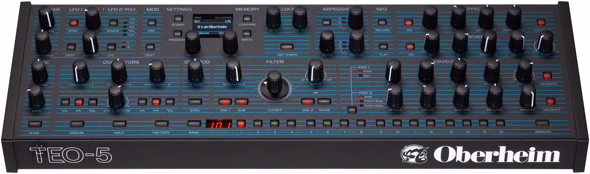 Az Oberheim TEO-5 asztali modul autentikus analóg hangzást biztosít kompakt asztali formában, amelyet a legendás OB-X, Four Voice és TVS modellek ihlettek. Az öthangú architektúra egy pár VCO-val meleg háromszög-, fűrészfog- és impulzushullámokat generál, míg a fejlett , nullán átmenő FM funkció teljesen új hangzásbeli textúrákat nyit meg.