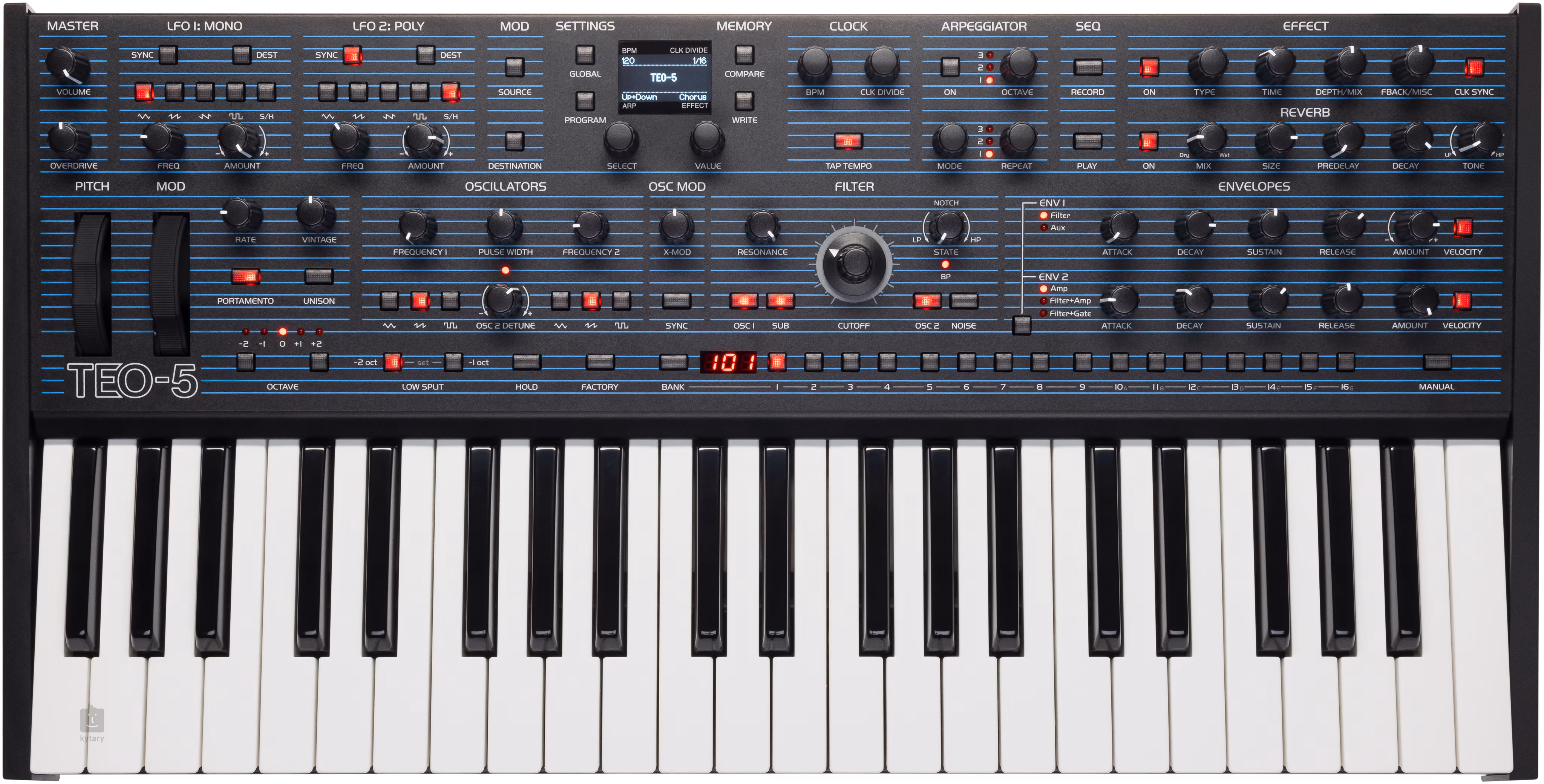 Ha tetszik Önnek a kombináció és a megbízható analóg hangzás modern lehetőségekkel való ötvözése, akkor az Oberheim TEO-5 ideális választás a produkciójához.