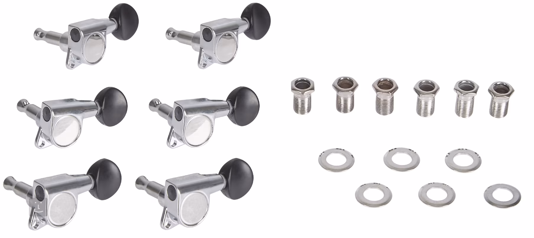 Hangolási mechanizmusok elektromos gitárhoz. Fémből készültek krómozott kivitelben, a fogók tartós fekete műanyagból készültek. Hat mechanikával rendelkező hangszerekhez alkalmasak egy sorban.