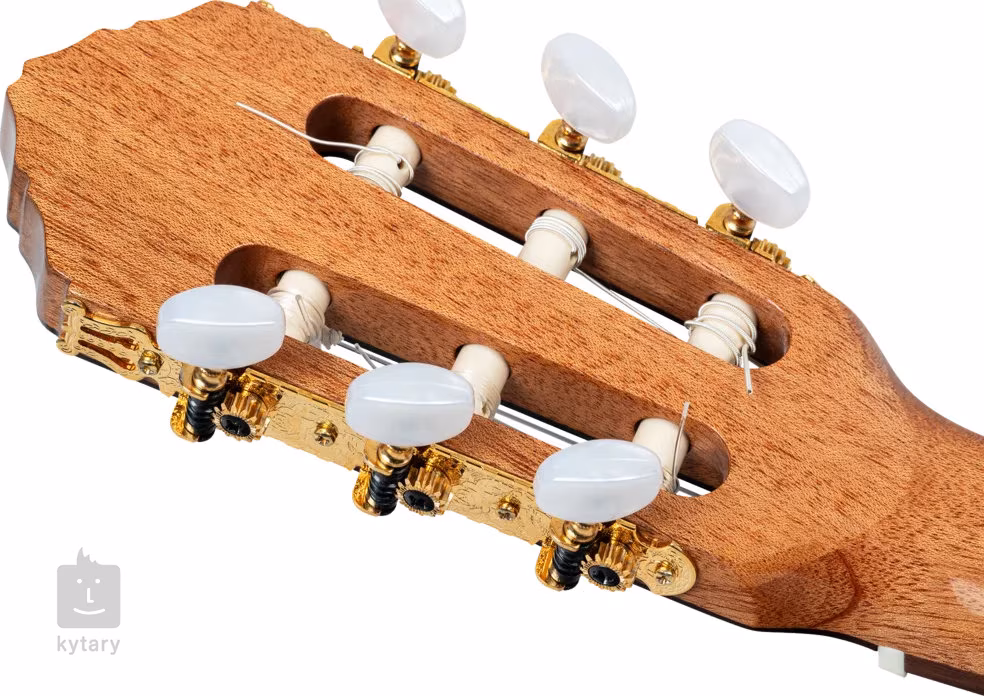 A húrok a nullás és a nyeregcsúszdán keresztül csontból készült klasszikus hangolókulcsokba és paliszanderfa húrtartóba vannak rögzítve. A szép kivitelezést kiemeli a magasfényűre csiszolt lakk, a juharfából készült szegély és a cég logója a hangszer fején.