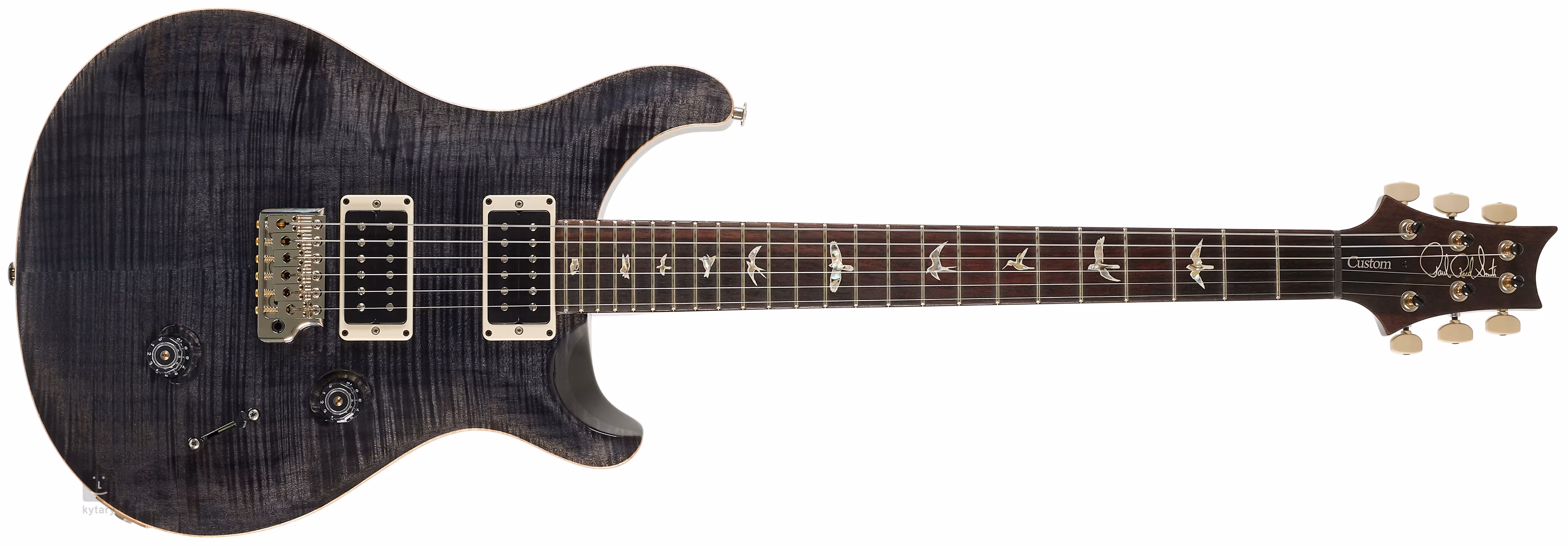 A Custom 24 Gray Black modell első pillantásra megragadja a tekintetet az ergonomikusan formázott mahagóni test kombinációjával, a jellegzetes PRS double cutaway-jel és a figurált juharfából készült, hűvös famintázatú tetővel. A Pattern Thin profilú, egyrészes mahagóni nyak egy huszonnégy bunddal ellátott rózsafa fogólapra van ragasztva. A fogólapon való tájékozódást a PRS védjegyének számító, gyöngyházszínű madársziluettek formájú pozíciójelzők segítik.