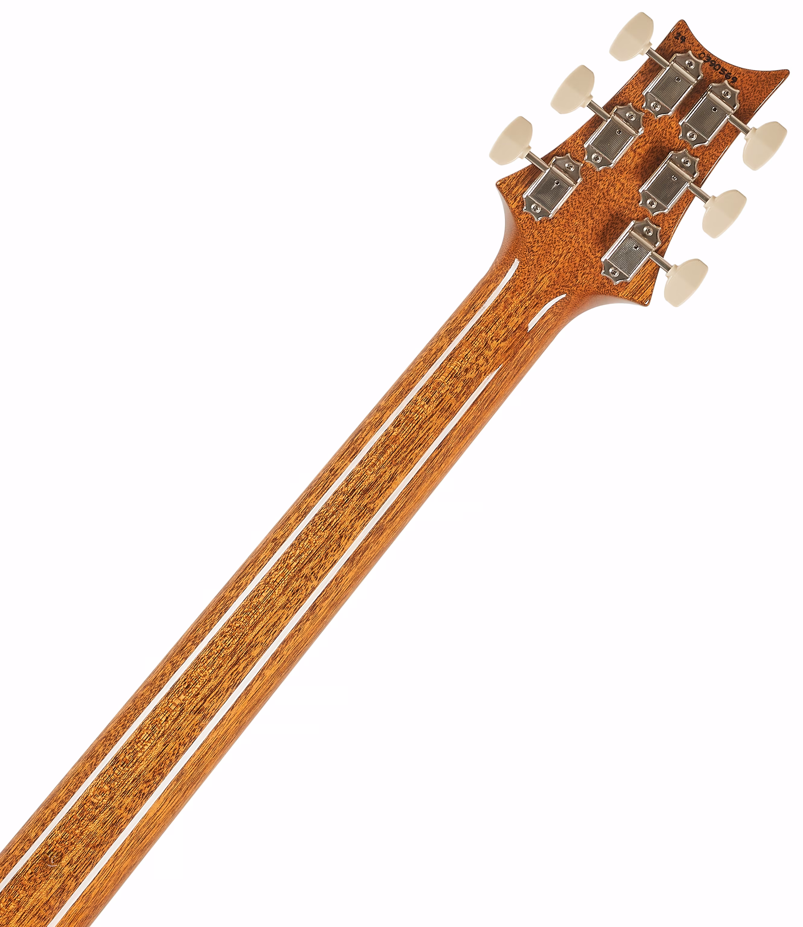 A McCarty Red Tiger elektromos gitár a vintage gitárok lelkével, hagyományos PRS testkialakítással és nagyszerű játékjellemzőkkel rendelkező hangszer. Kicsit teltebb, ergonomikusan formázott mahagóni testtel rendelkezik, szélesebb háttal és díszes figurás juharfából készült tetővel. A Pattern-profilú mahagóni nyakhoz egy huszonkét bunddal ellátott, bundozott rózsafa fogólap van ragasztva. A fogólapon való tájékozódást a PRS védjegyének számító, fényűző gyöngyházmintás madársziluettek formájában megjelenő pozíciójelzők segítik.