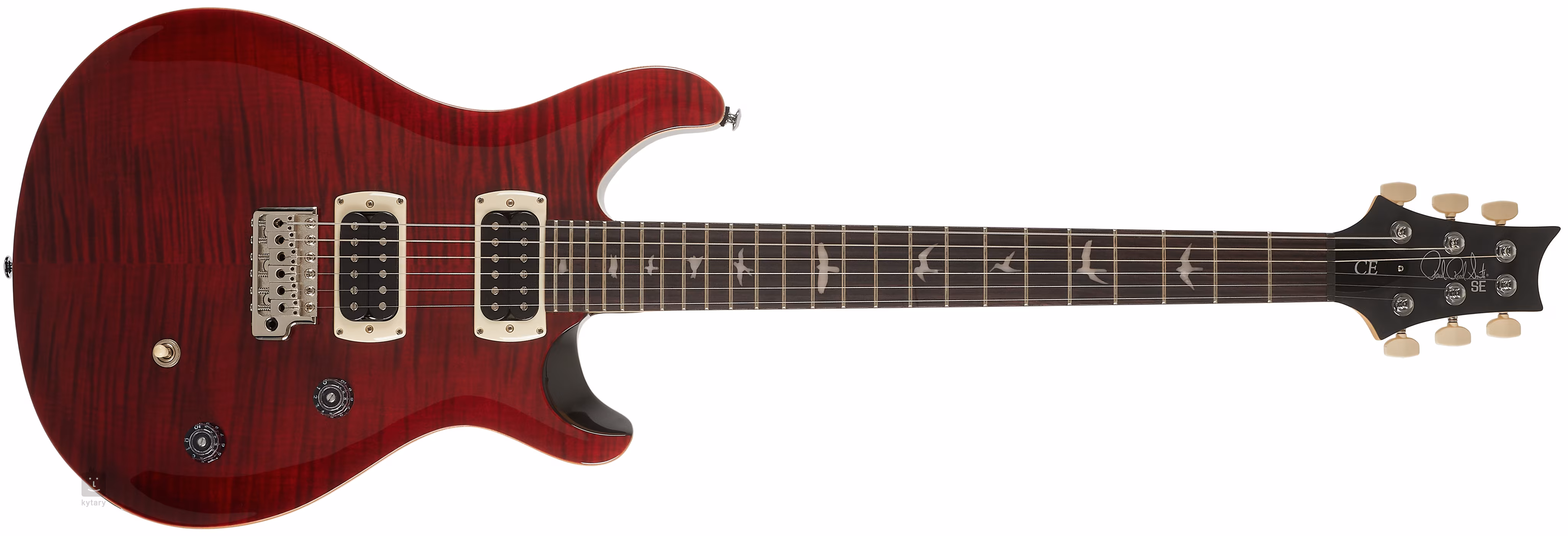 A SE CE24 Black Cherry 2026 gitár mahagóni testét látványos, fládrovaný juharfa fedlap díszíti. A Shallow Violin carve kivágás minőségében a hangszer játék tulajdonságait a drágább amerikai Core sorozat modelljeihez közelíti. A Wide Thin profilú juhar nyakhoz 24 bundos paliszander fogólap van ragasztva. A fogólapon való orientációt madársziluettek formájú pozíciójelölések segítik.