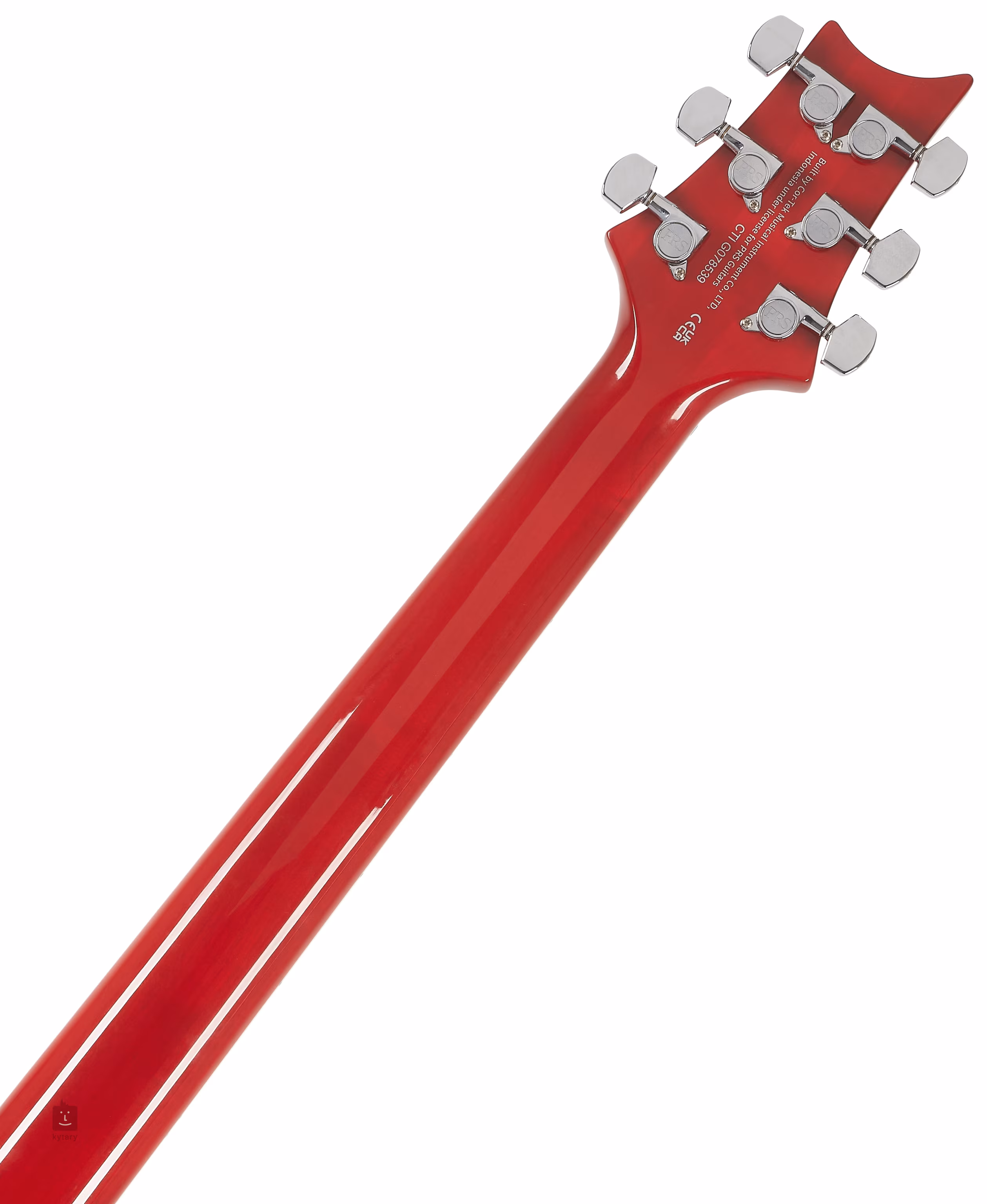 A PRS SE Custom 24-08 elektromos gitárok az olcsóbb SE sorozatból eredeti PRS testkialakítással, két kivágással és a márka hírnevét igazoló kiváló kivitelezéssel rendelkeznek. A standard Custom 24 modellektől az elektronikájukban különböznek, ahol a push/pull hangszínszabályzót két mini coil-tap kapcsoló váltja fel, szélesebb hangbeállítási lehetőségekkel (a névben szereplő 08 a 8 különböző pickup konfigurációra utal). A SE Custom 24-08 Quilt package Charcoal Cherry Burst gitár mahagóni testét juharfedel és látványos felületi furnér díszíti. A Shallow Violin carve kivágás minőségében közelíti meg a drágább amerikai Core sorozat modelljeinek játék tulajdonságait. A Wide Thin profilú juharfából készült nyakhoz 24 bundos ébenfa fogólap van ragasztva. A fogólapon való orientációt gyöngyházból készült madársziluettek formájú pozíciójelölések segítik. A két gyári humbucker tiszta hangzást biztosít a gitárnak, amely a humbuckerek teljességén kívül két mini coil-tap kapcsolóval a single-coilek ütőerejét vagy a soapbar hangszedők teltebb hangzását is kínálja. A hang karakterét standard vezérlőkkel lehet beállítani. A húrok a szabadalmaztatott PRS tremolóban vannak elhelyezve, a hangolás stabilitását pedig a kiváló minőségű PRS mechanika garantálja. A gitár tokban (gig bag) kerül forgalomba. A Paul Reed Smith műhelyéből származó PRS gitárok az egyik leguniverzálisabb és legmegbízhatóbb hangszerek közé tartoznak. Kiváló hangzásuknak és kényelmes játékuknak köszönhetően olyan zenészek kedvenceivé váltak, mint Santana vagy Mark Tremonti. A márka kínálatában a bevált klasszikusok mellett balkezes modellek, hét húros, bariton és félakusztikus gitárok, valamint híres gitárosok signature modelljei is megtalálhatók. Az SE jelöléssel ellátott hangszerek Indonéziában készülnek. Minőségük miatt azonban nem kell aggódni – a gyártási szabványok és a gondos végső ellenőrzés természetesen garantált.