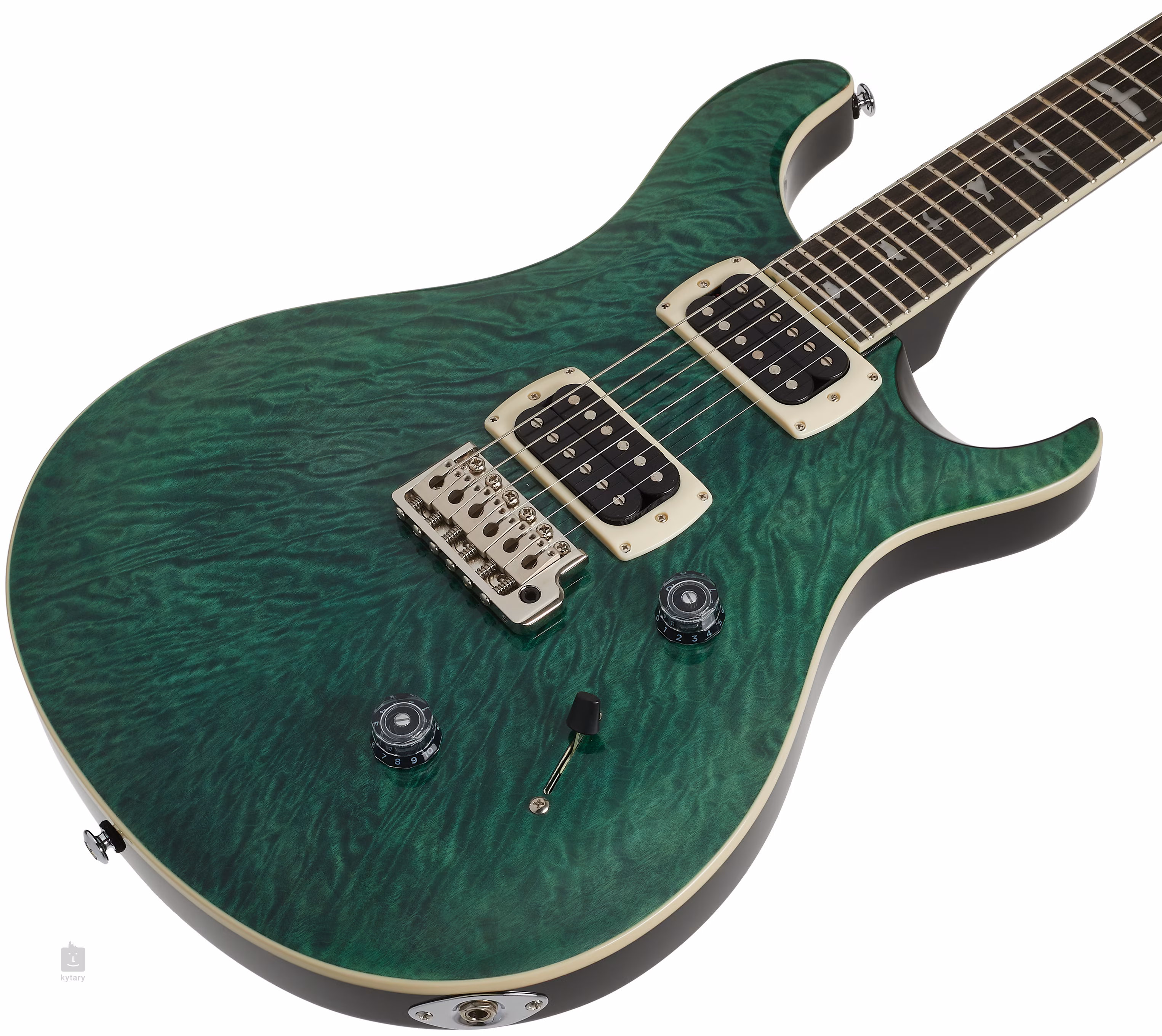 A SE Custom 24 Quilt Package Teal Black 2026 gitár mahagóni testét juharfedel és látványos felületi furnér díszíti. A Shallow Violin carve kivágás minőségében közelíti meg a drágább amerikai Core sorozat modelljeinek játék tulajdonságait. A Wide Thin profilú juhar nyakhoz 24 bundos ébenfa fogólap van ragasztva. A fogólapon a madársziluettek formájú pozíciójelölések segítik a tájékozódást.