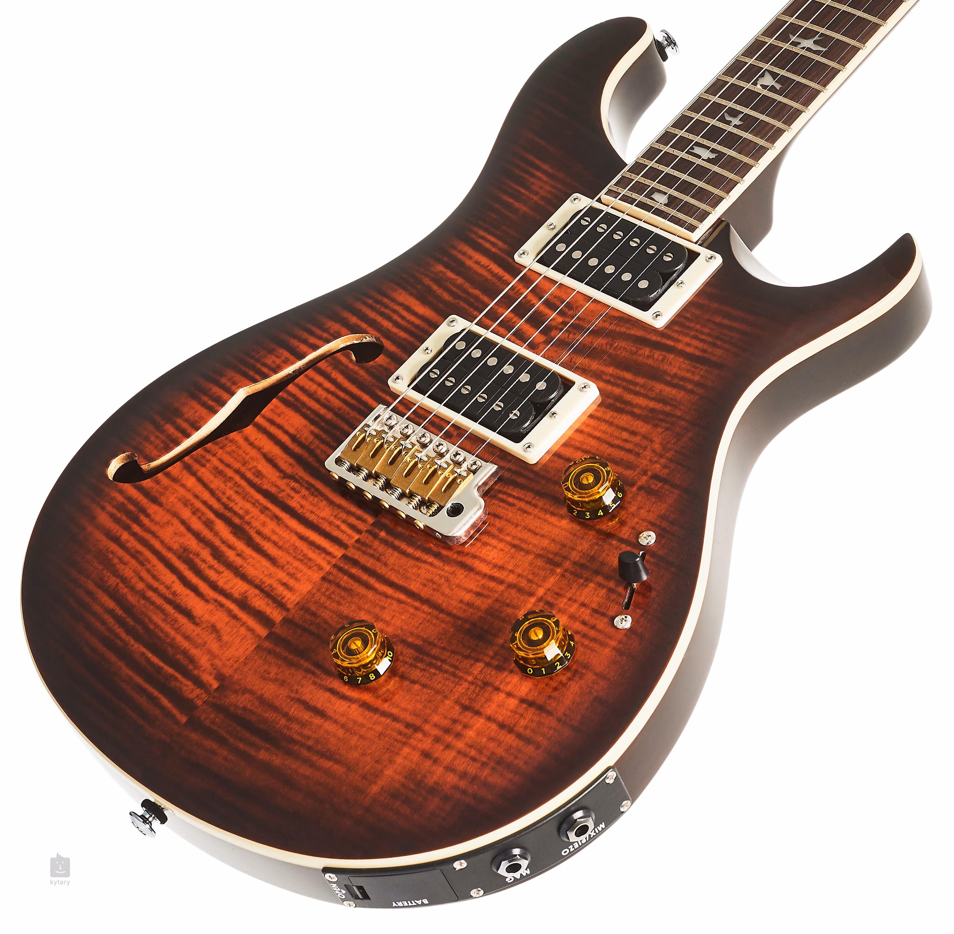 Az SE Custom 24 Semi-Hollow Piezo Orange Orange Tiger Smokeburst mahagóni testét juharfából készült tető és díszes, lángolt juhar furnér díszíti. A Shallow Violin faragás a hangszer játszhatóságát minőségben közelebb hozza a drágább American Core Series modellekhez. A huszonnégy fogólappal ellátott rózsafa fogólapot egy Wide Thin profilú juhar nyakra ragasztották. A gyöngyházfényű madársziluettek formájú pozíciójelzők megkönnyítik a fogólapon való tájékozódást.