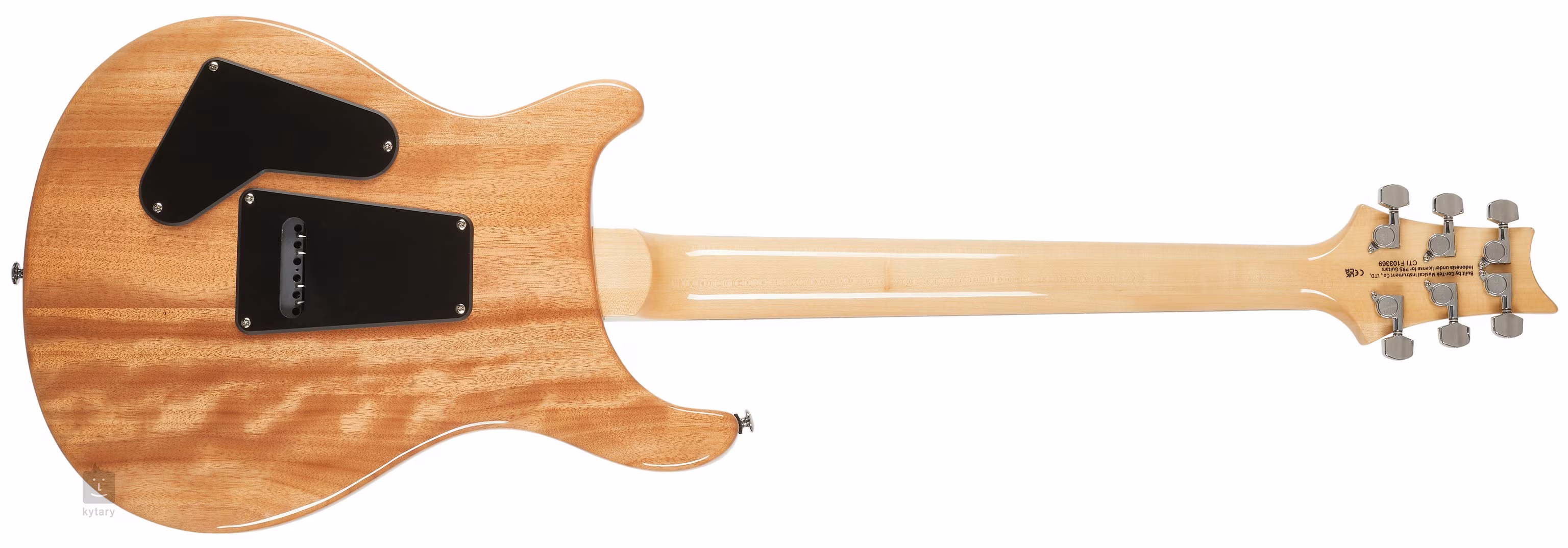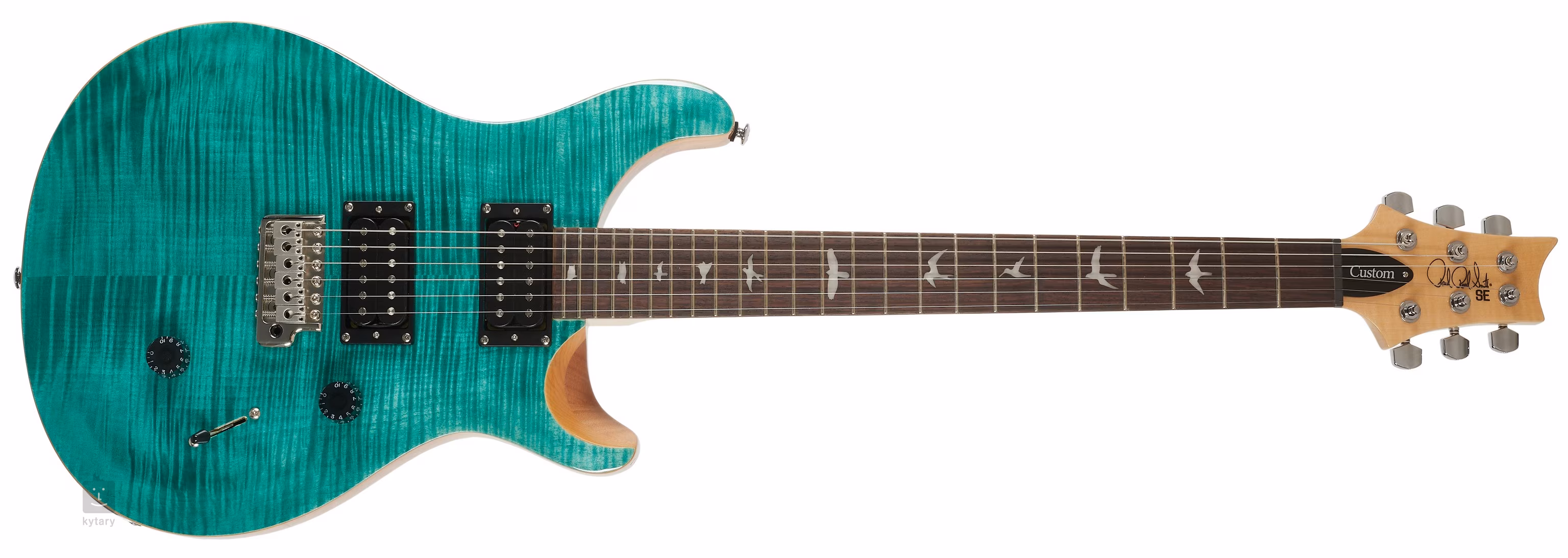 Az SE Custom 24 Turquoise gitár mahagóni testét juharfedél és látványos, szálirányú juharfa furnér díszíti. A Shallow Violin carve kivágás minőségével a hangszer játékélményét a drágább amerikai Core sorozat modelljeihez közelíti. A Wide Thin profilú juhar nyakhoz 24 bunddal ellátott paliszandrum fogólap van ragasztva. A fogólapon a gyöngyházból készült madársziluettek formájú pozíciójelölők segítik a tájékozódást.