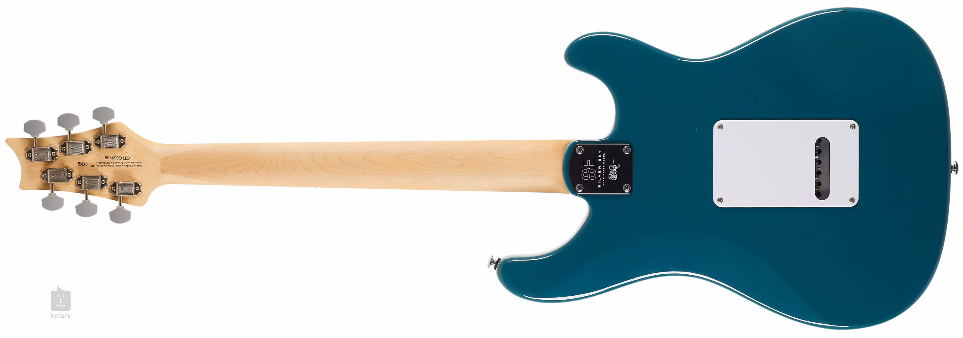A PRS SE Silver Sky LH Silver Sky LH Nylon Blue elektromos gitár teste nyárfából készült. A csavarozott juhar nyak az eredeti 635JM kivágással/profillal rendelkezik, a juhar fogólap felületét huszonkét bund és madársziluett formájú pozíciójelzők tagolják.