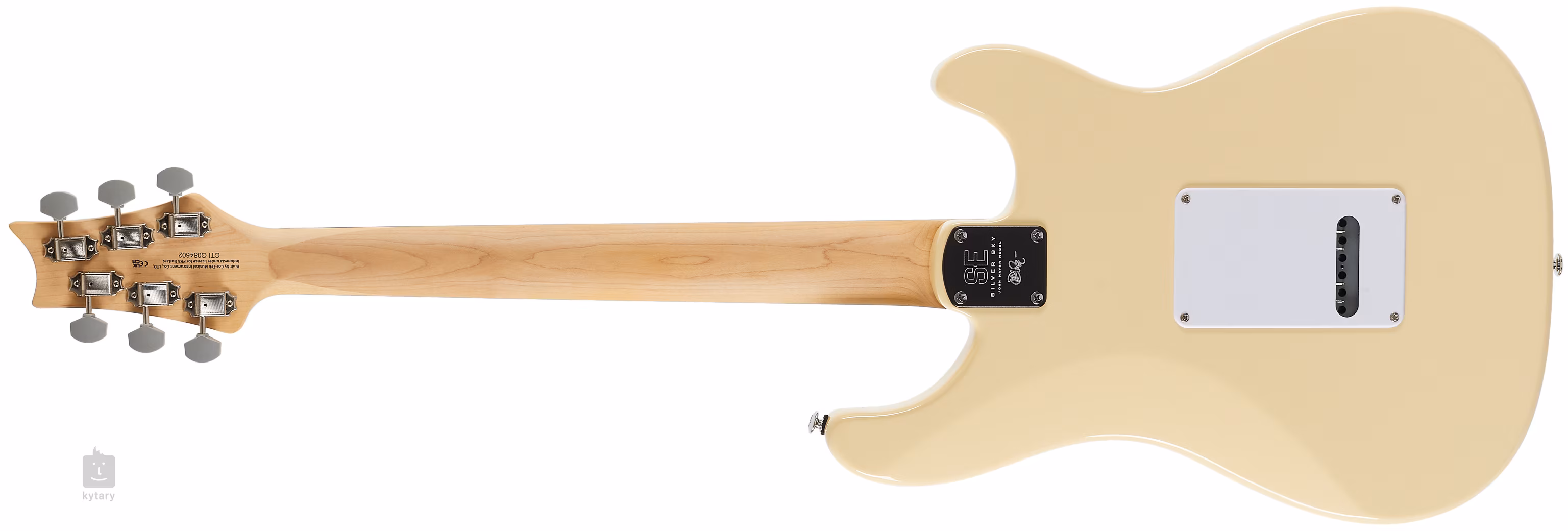 A PRS SE Silver Sky LH Moon White elektromos gitár teste nyárfából készült. A huszonkét bunddal ellátott rózsafa fogólapot egy csavarozott juhar nyakra ragasztották. A nyak az eredeti 635JM kivágással/profillal rendelkezik, a fogólapon pedig madársziluett formájú pozíciójelzők könnyítik meg a tájékozódást.