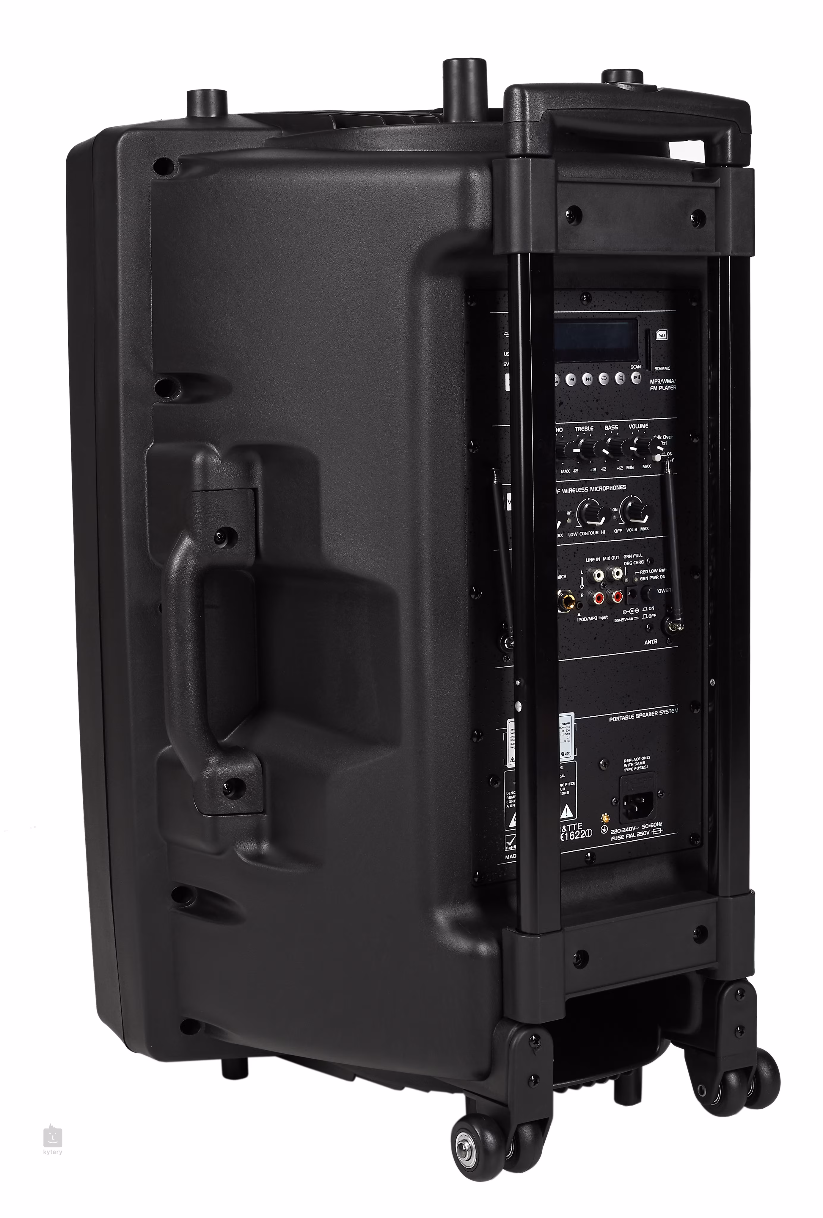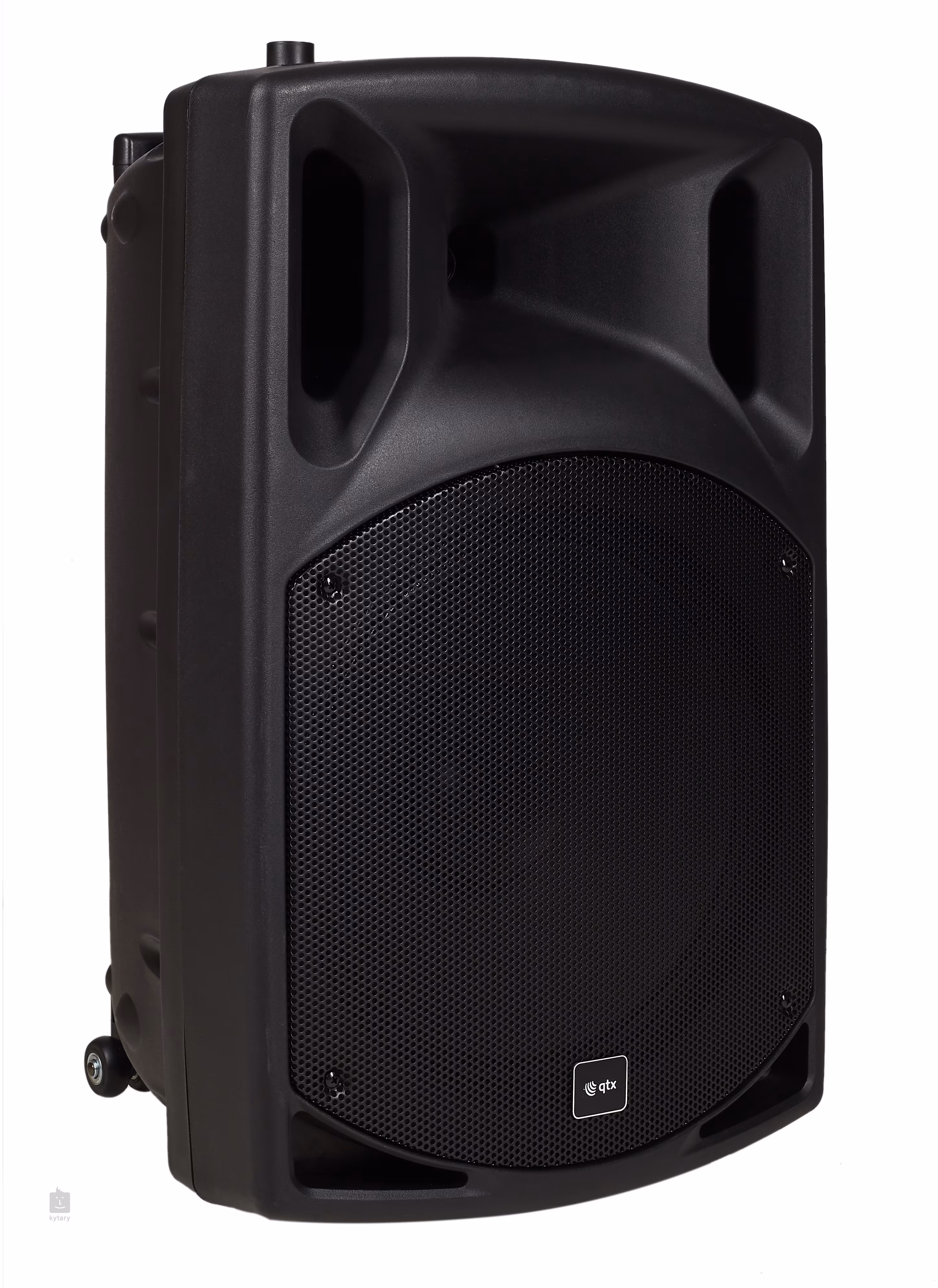 Hordozható PA 15" hangszórórendszer QX sorozat. Beépített erősítő 50+50W RMS kimeneti teljesítménnyel (LF+HF), hálózati vagy belső akkumulátorral táplálva (akár 8 órás akkumulátoros üzemidő). Tartalmaz 2x VHF kézi vezeték nélküli mikrofonokat (frekvencia 174,1MHz + 175,0MHz), beépített vevőt és erősítőt a hátoldalon, beleértve a kezelőszerveket (hangerőszabályzó, visszhanghatás, basszus- és magasságkorrekció és vezeték nélküli mikrofonbemenet szintjének szabályozása), 2 további mikrofonbemenetet és Bluetooth™ vevőt. Behúzható fogantyú és kerekek a könnyű kezelés és szállítás érdekében. Tápellátás: külső - 220/240V AC, 50/60Hz, belső - beépített 12V-os akkumulátor.