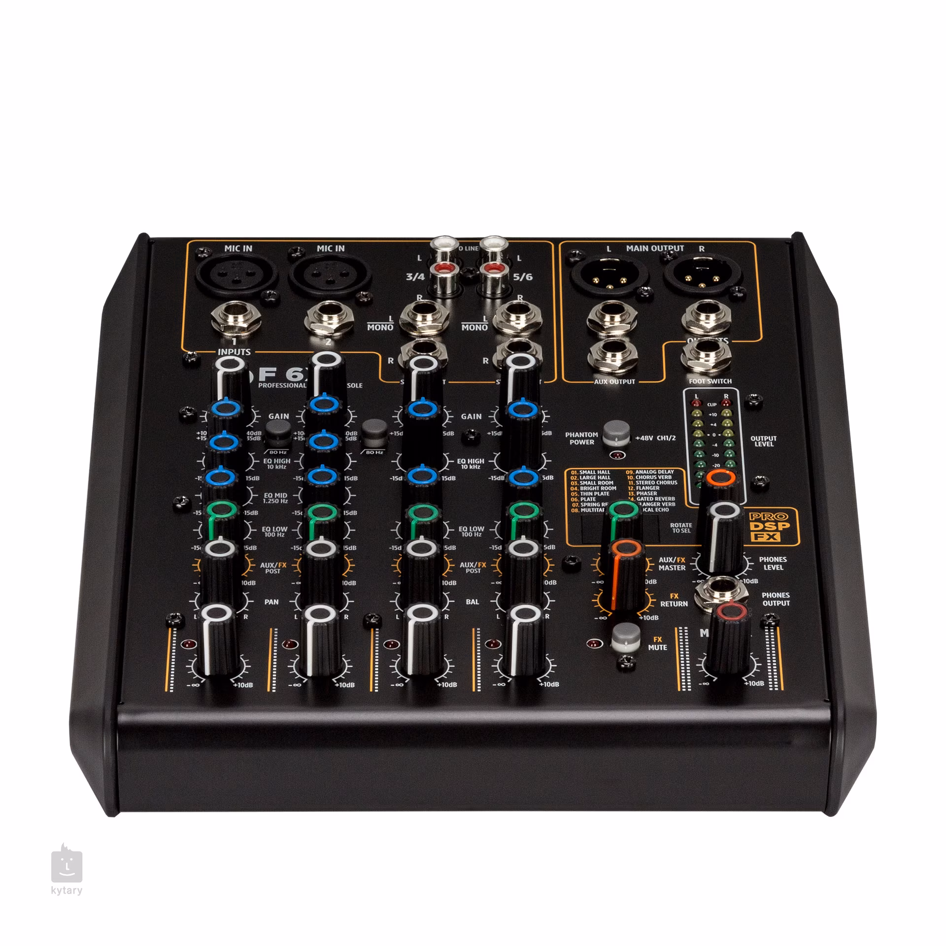 RCF - F 6X A hatcsatornás keverőpult két XLR/Jack 6,3 mm-es bemenetet kínál fantomtáplálással és két sztereó Jack 6,3 mm/RCA bemenetet. A hangszerbemenetek háromsávos EQ-t tartalmaznak, míg a sztereó csatornák kétsávos EQ-n keresztül kínálnak jelkondicionálást. A sztereó XLR/Jack 6,3 mm-es kimenetek lehetővé teszik az F 6X csatlakoztatását egy másik PA-hoz, a fejhallgató kimenet pedig biztosítja az audiojel maximális ellenőrzését. A keverőpult kiváló minőségű acélból készült, így a szállítás során is ellenáll a megpróbáltatásoknak.