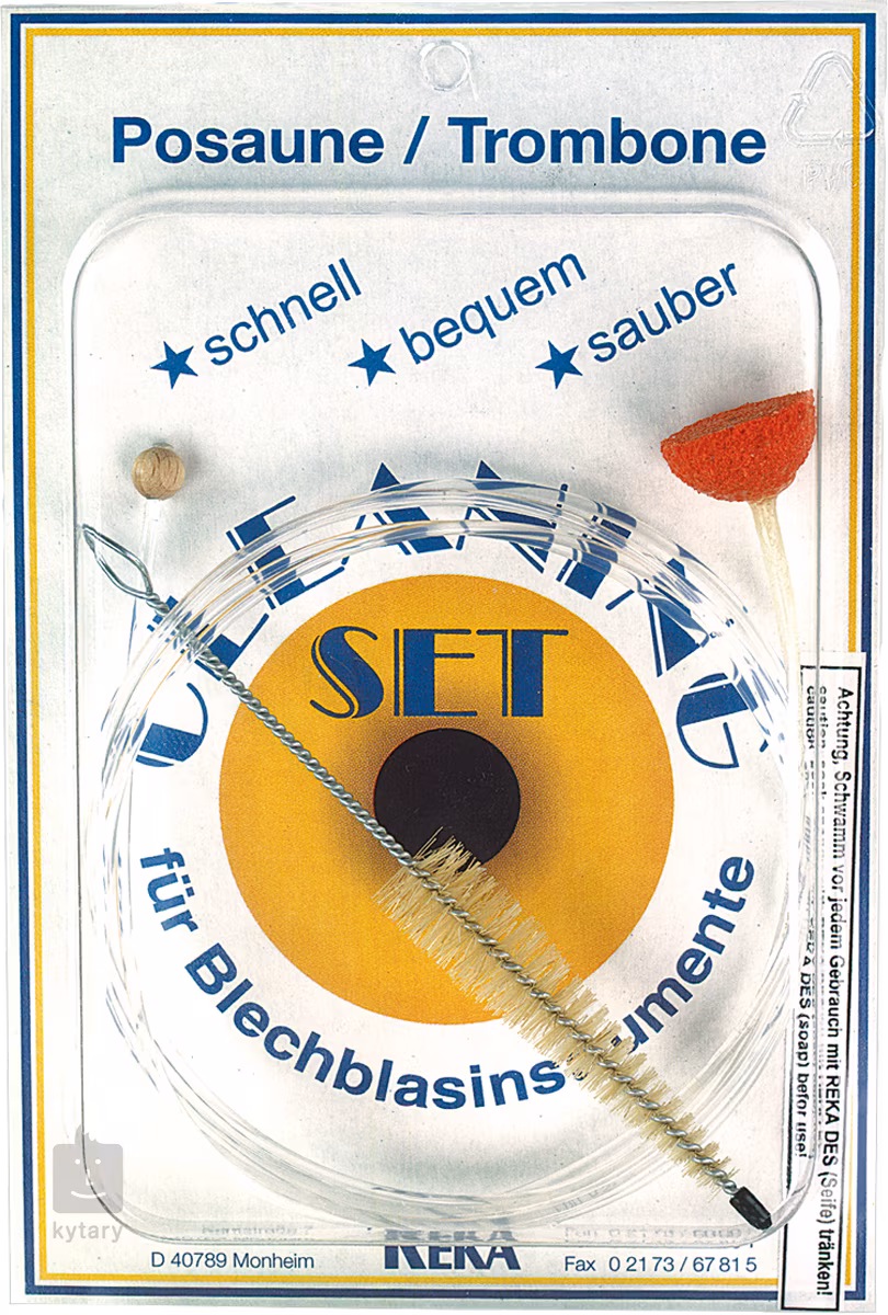 A Reka tenor vagy bariton tisztító készlet tartalmaz egy kefét a szájrész tisztításához és egy törlőkendőt a hangszer alsó részének és dugattyúinak tisztításához.