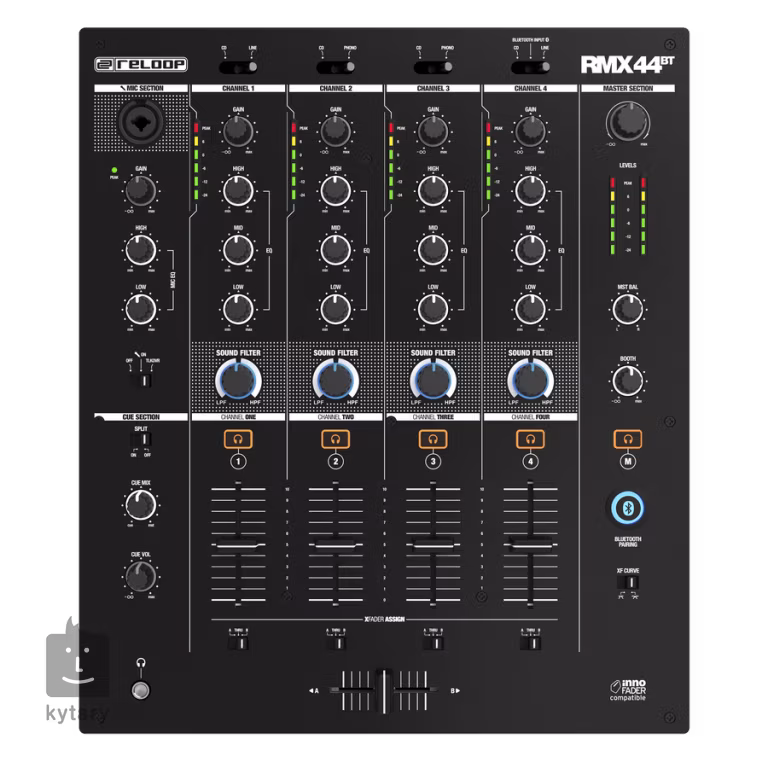 A Reloop RMX-44 BT egy kompakt négycsatornás klubmixer digitális felépítéssel, Bluetooth vezeték nélküli technológiával és integrált Instant Sound Colour effektekkel. Ugyanazoknak az audio szabványoknak felel meg, amelyek a Reloop zászlóshajó keverőpultjában, az RMX-80-ban is megtalálhatóak.