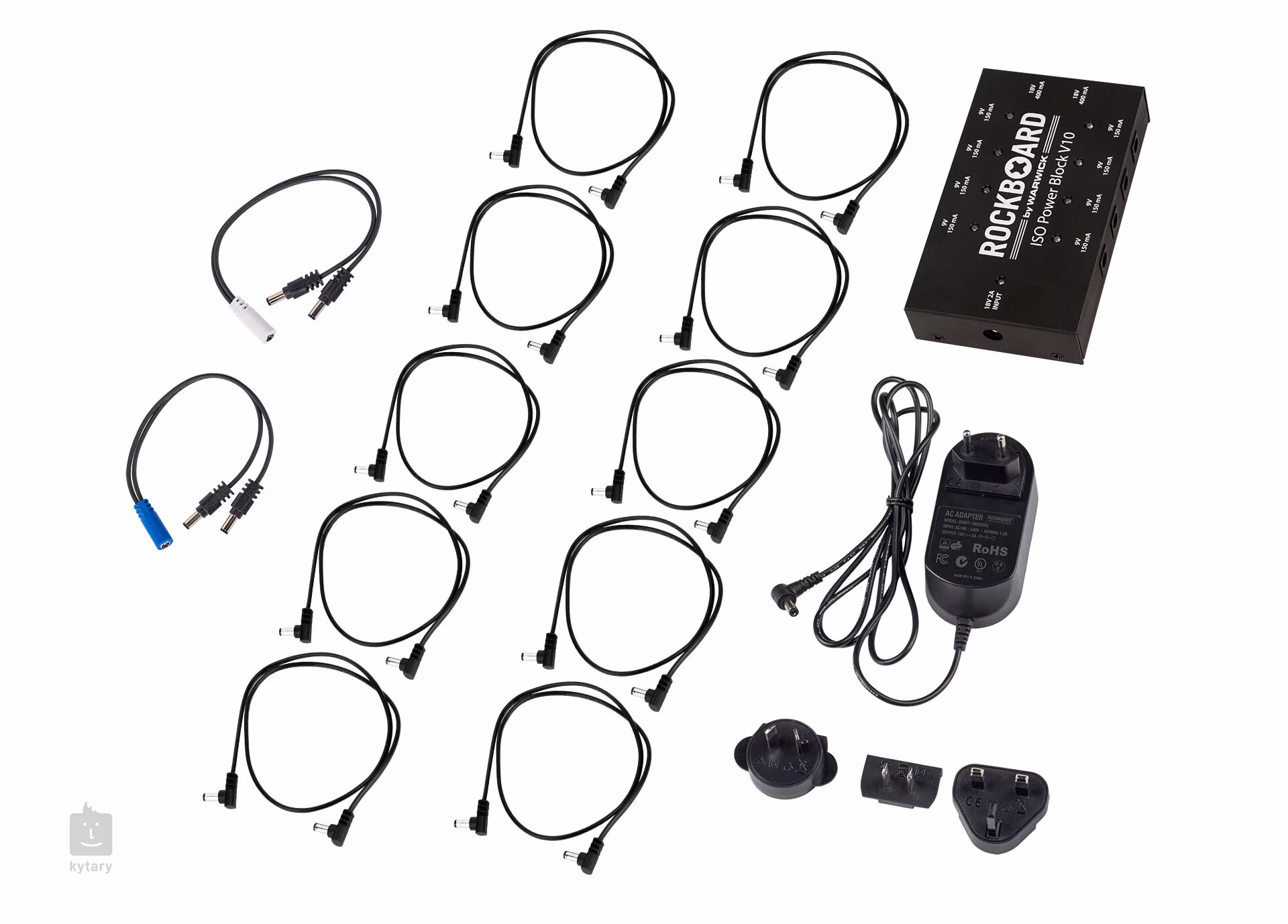 A RockBoard ISO Power Block V10 V2 multiadapter nyolc transzformátorral szigetelt 9V DC kimenetet kínál 150 mA maximális fogyasztással a leggyakoribb effektpedálok és két 18V DC kimenetet 400 mA maximális fogyasztással a nagyobb energiaigényű eszközök számára. Az egyes tápcsatlakozókra alkalmazott szűrőtechnológia megakadályozza a magas frekvenciájú zajokat. A fontos funkciók közé tartozik továbbá az egyes tápcsatlakozóknál található LED-jelzés és a túlfeszültség-védelem, amely rövidzárlat esetén megvédi a csatlakoztatott pedál-effekteket a károsodástól.