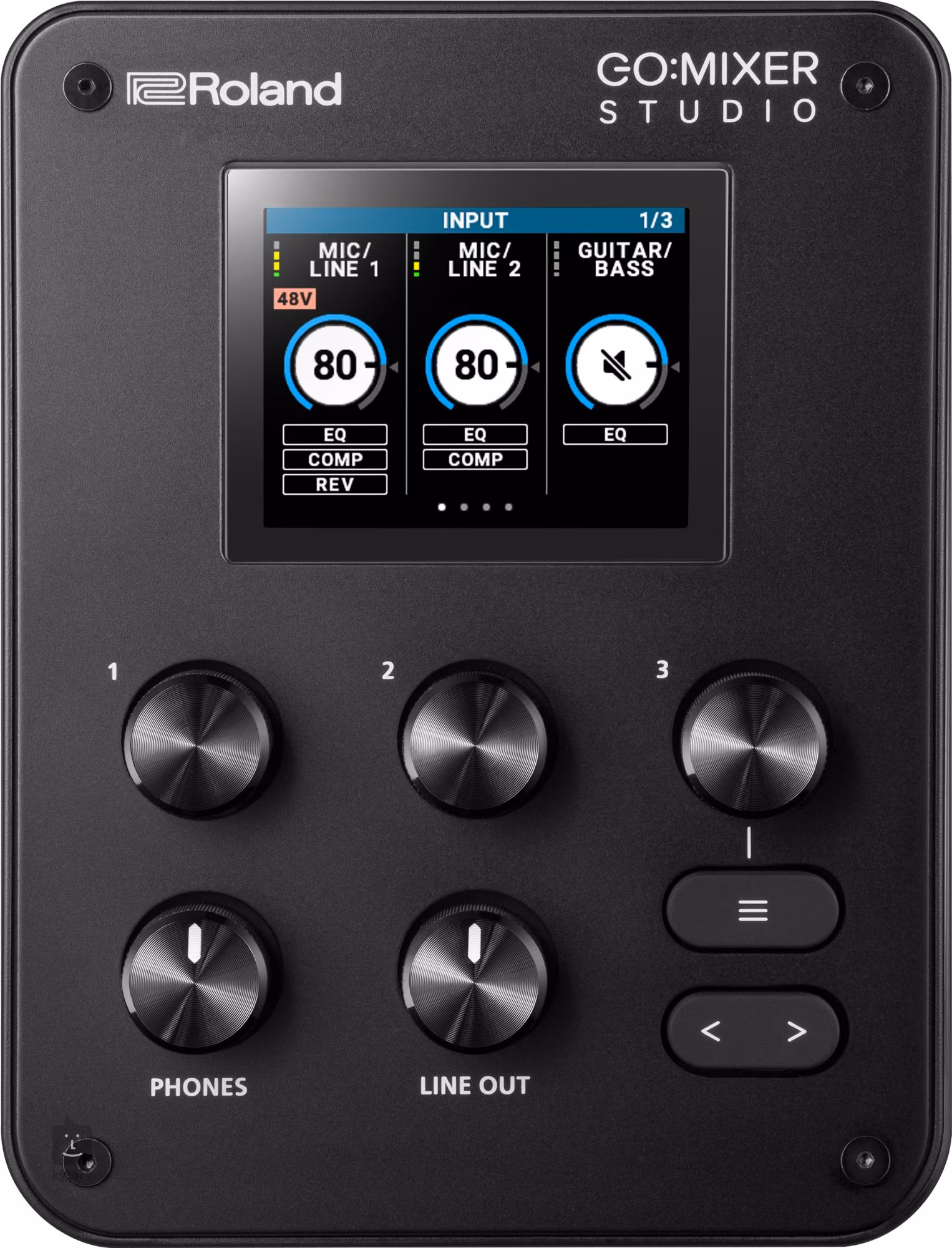 A GO:MIXER STUDIO nagy előnye a kimeneti rugalmassága. Két vonalbemenet áll rendelkezésre monitorok vagy hangosítás csatlakoztatásához, 6,3 mm-es fejhallgató-kimenet és mini jack fejhallgatóhoz, headsethez vagy külső mikrofonhoz. A kezelés maximálisan intuitív a fizikai forgógombok és a áttekinthető színes kijelzőnek köszönhetően, ami jelentősen megkönnyíti a munkát a terepen is.