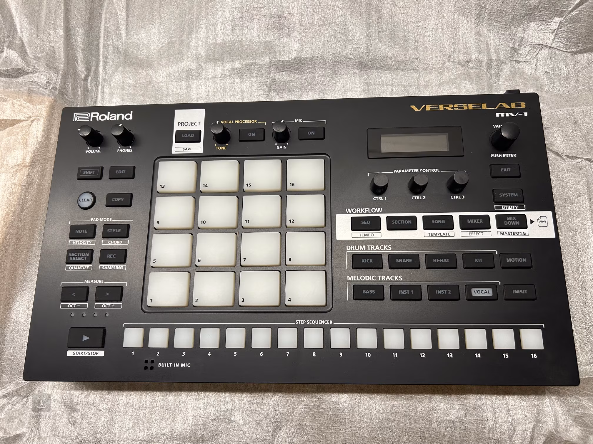 A Verselab MV-1 egy nagy teljesítményű produkciós állomás a Roland-tól, amely ideális környezetet biztosít új dalainak vagy ötleteinek felvételéhez, produkciójához, keveréséhez és mastereléséhez. Szabadjára engedheti gondolatait és kreativitását, ráadásul a ZEN-Core alkalmazásból akár három ezer hang is rendelkezésre áll. A Verselab MV-1 teljes mértékben kompatibilis PC-vel, laptopokkal, táblagépekkel és okostelefonokkal, így egyszerűen remek útitárs lesz. Kávét nem főzök, de egyébként keményen dolgozom... Ez a kis gép tényleg mindent elintéz, új számokat, mintákat készíthetsz, keverhetsz felvételeket és alkalmazhatsz különböző modern, stúdióminőségű effektusokat, mint például: Auto-Pitch, Harmonizer és Doubler. 16 háttérvilágítású pad és 16 lépéses szekvencer áll rendelkezésre a ritmusok, basszusvonalak és dallamok létrehozásához. A dalszerzéshez szükséges eszközök pedig a megfelelő hangulatba hoznak és ideális feltételeket teremtenek a kreatív alkotáshoz. A Verselab MV-1 tápellátása AC adapterrel (a csomag része), mobil akkumulátorral vagy USB porton keresztül biztosítható. Mit találsz rajtam? Az intuitív kezelőpanelen kívül a Verselab MV-1 integrált mikrofont és áttekinthető szöveges kijelzőt is tartalmaz a hangok részletes beállításához, illetve a gyári vagy felhasználói presetek előhívásához. A maximális kényelmet a rugalmas csatlakozási lehetőségek biztosítják: két fejhallgató-kimenet a részletes monitorozáshoz, sztereó kimenet a stúdió monitorokhoz vagy PA-hoz való csatlakozáshoz, XLR-bemenet fantom táplálással kondenzátor mikrofonokhoz, vagy két vonalbemenet. A digitális átvitel MIDI In/Out csatlakozón és USB porton keresztül történik. Felvételeit SD/SDHC memóriakártyára (a csomag része) mentheti, amelynek nyílása a készülék hátulján található.