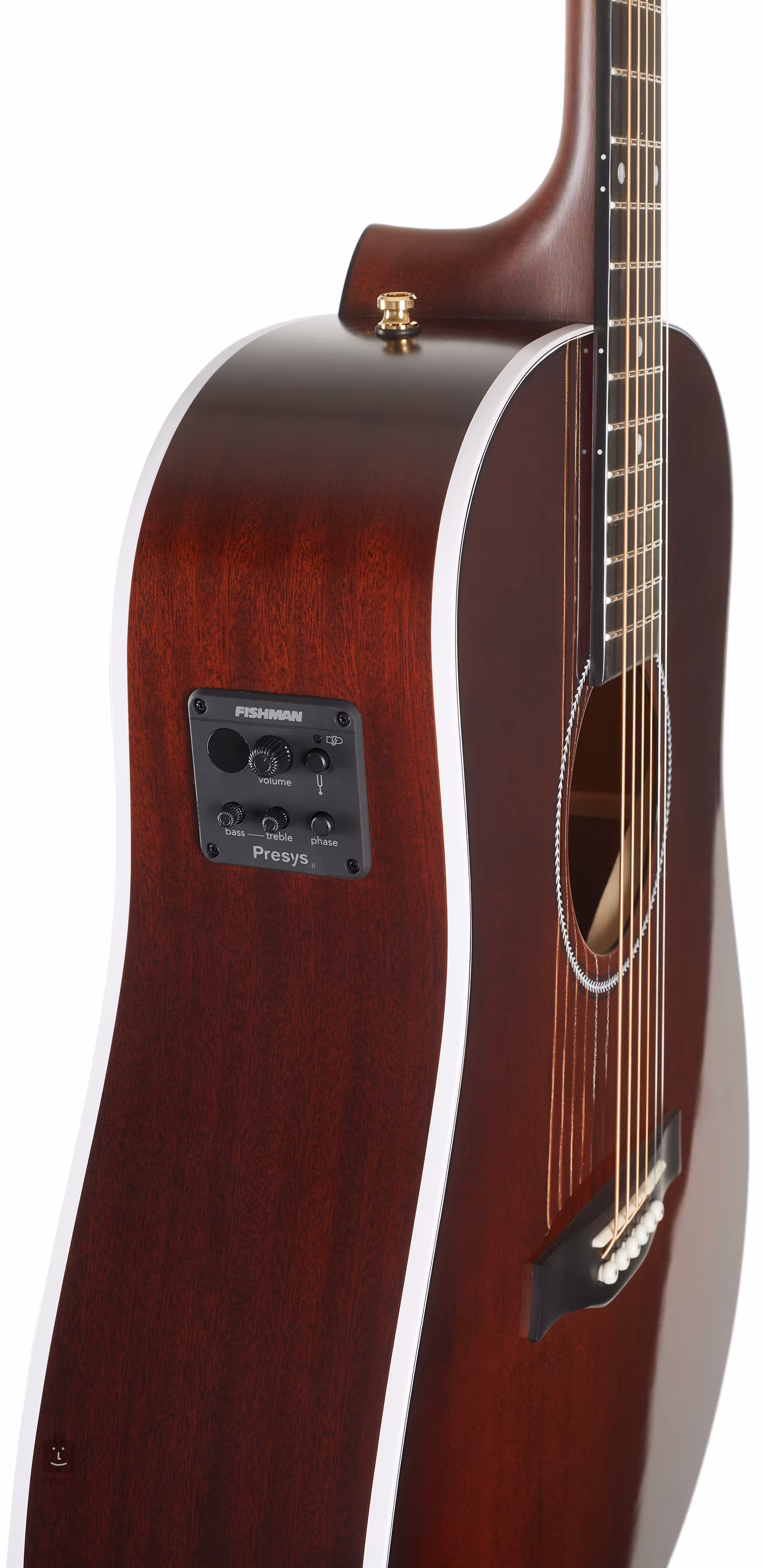 A Dreadnought Maritime SWS Maho Maho Burnt Umber GT Presys II testét lenyűgöző Burnt Umber fényes fényezés díszíti a tetőn és kontrasztos szatén fényezés a hátlapon és az oldalakon. A tömör test anyagait prémium minőségű faanyagok egészítik ki a mahagóni nyak és a paliszander fogólap formájában.