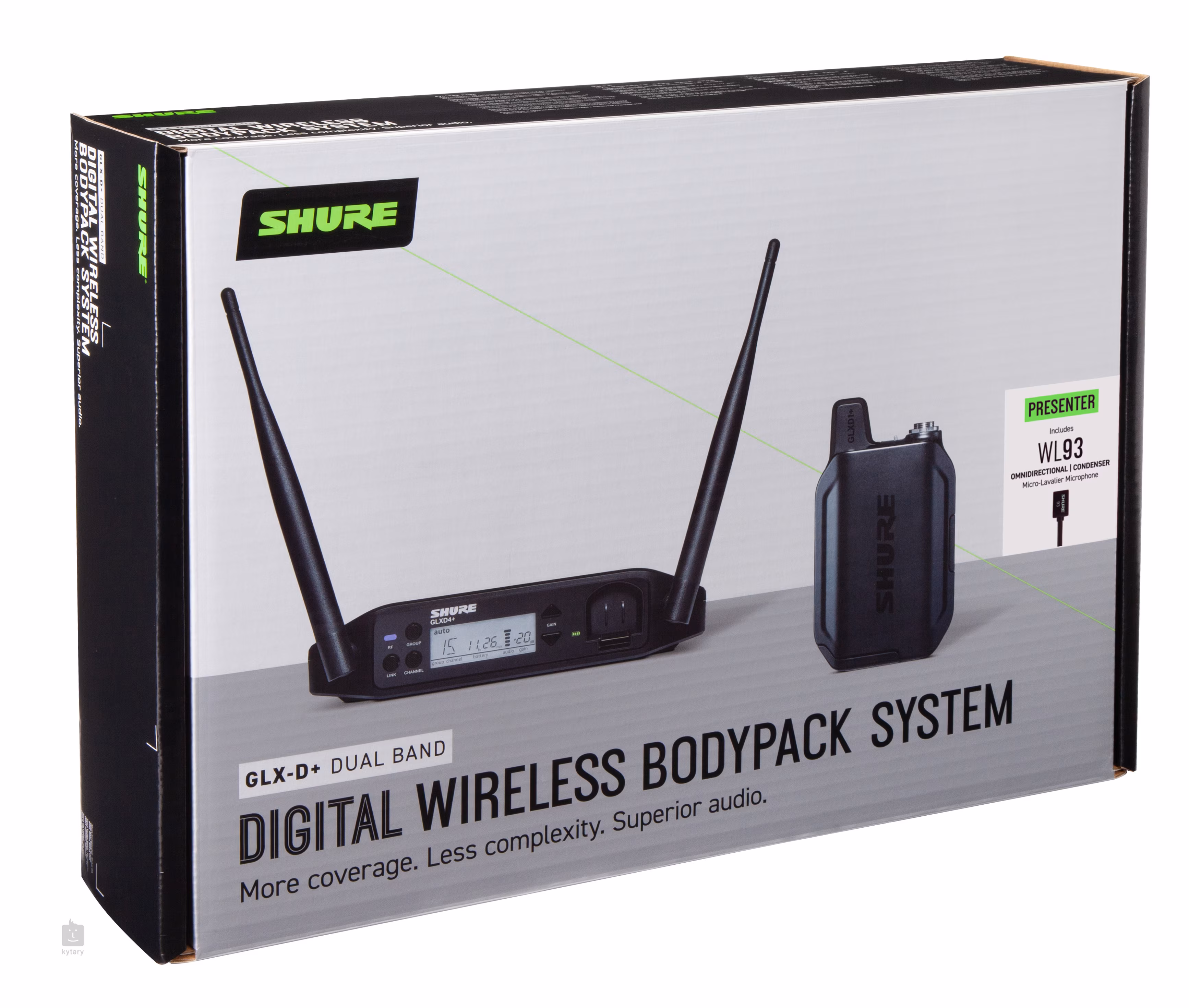 A GLXD14+ LAVALIER SYSTEM W/WL93 vezeték nélküli szett tartalmazza a WL93 miniatűr öles mikrofont, a GLXD1+ testre szerelhető adót és a GLXD4+ vevőt. A csomag tartalmaz egy tápegységet, SB904 li-ion akkumulátort és egy kemény fekete tokot.