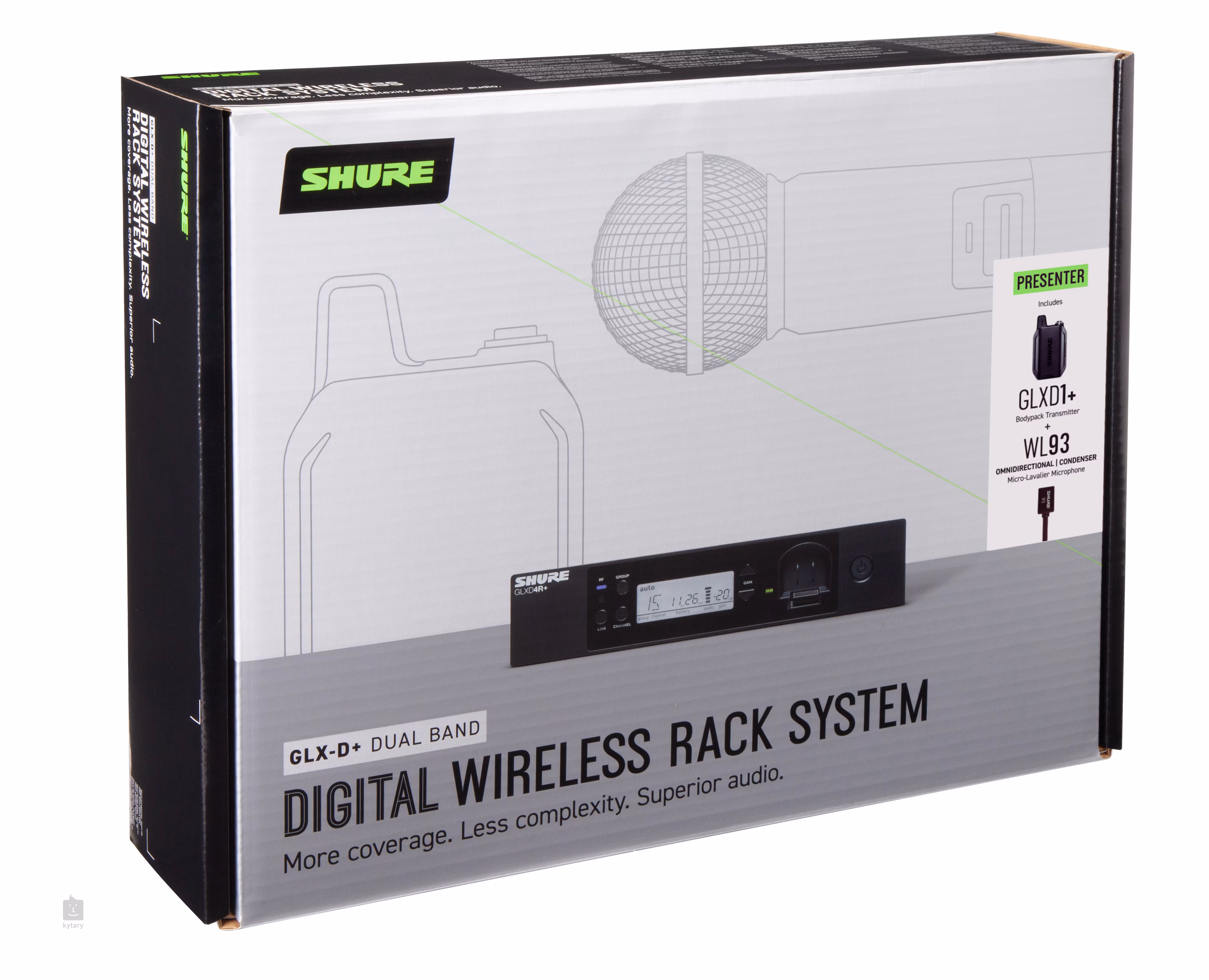 A GLXD14R+ LAVALIER SYSTEM WITH WL93 vezeték nélküli készlet tartalmazza a WL93 miniatűr öles mikrofont, a GLXD1+ testre szerelhető adót és a GLXD4R+ rackbe szerelhető vevőt. A csomag tartalmaz egy tápegységet, SB904 li-ion akkumulátort, rack hardvereket és egy cipzáras vinyl tokot.