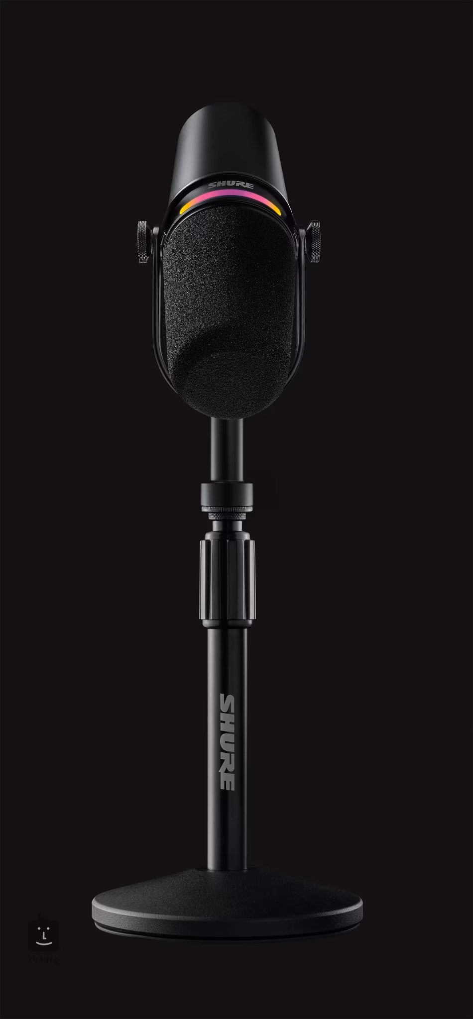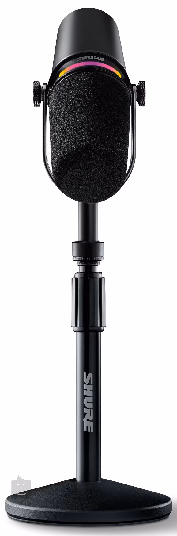 A Shure MV7+ Podcast Kit egy dinamikus mikrofon testreszabható LED-es érintőképernyővel, erőteljes DSP funkciókkal és még jobb hangzással, igényes podcasterek, streamelők és zenészek számára. A készlethez tartozik egy speciális, állítható asztali állvány, amelyet a Gator készített, és amelyen a Shure logó látható.
