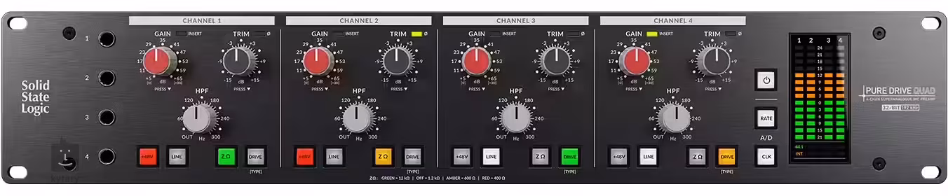 A Solid State Logic Pure Drive Quad a nagyszerű mikrofon-előerősítő modern változata, amely a híres SuperAnalogue PureDrive topológián alapul, amelyet az Origin hangfelvevőkonzolban használtak. Az új Drive üzemmód mellett azonban elsősorban széleskörű csatlakoztathatóságot kínál, és a képességek vonal- és hangszerjelfeldolgozással bővülnek, a legmodernebb digitális átalakítást és integrált USB-C audiointerfészt biztosítva. Mindezt kompakt, 2U rack formátumban.
