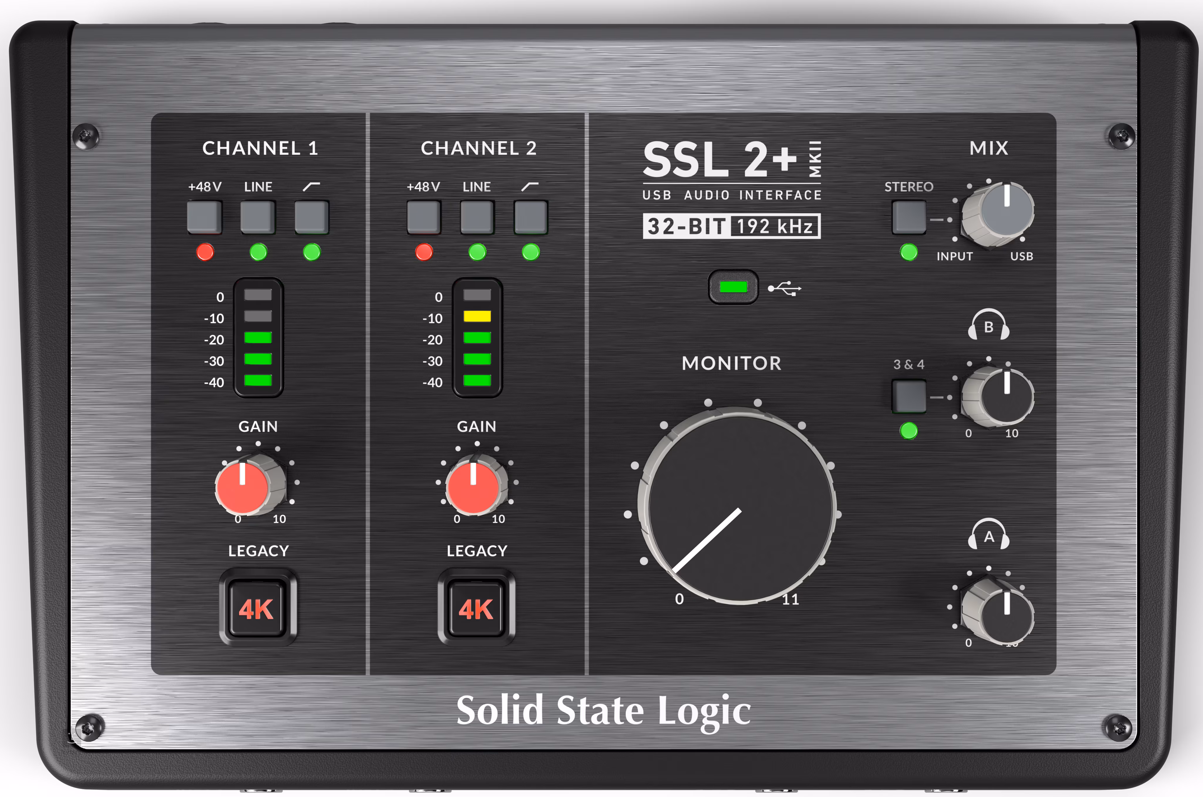 Az új SSL2+ MKII számos jelentős fejlesztéssel és gondosan kiválasztott kiegészítő funkcióval épül elődjére. Az újratervezett megjelenés mellett jelentős előrelépés a csúcskategóriás 32 bit / 192 kHz felbontású konverterekre való átállás. Különösen a gitárosok örülhetnek a két HiZ bemenetnek, és a felhasználók mostantól két újratervezett fejhallgató kimenetet is élvezhetnek. Mindkét esetben a csatlakozókat az előlapra hozták ki, ami sokkal praktikusabb megoldás, mint az előző modellnél, ahol a hozzáférés csak a váz hátsó részén található.