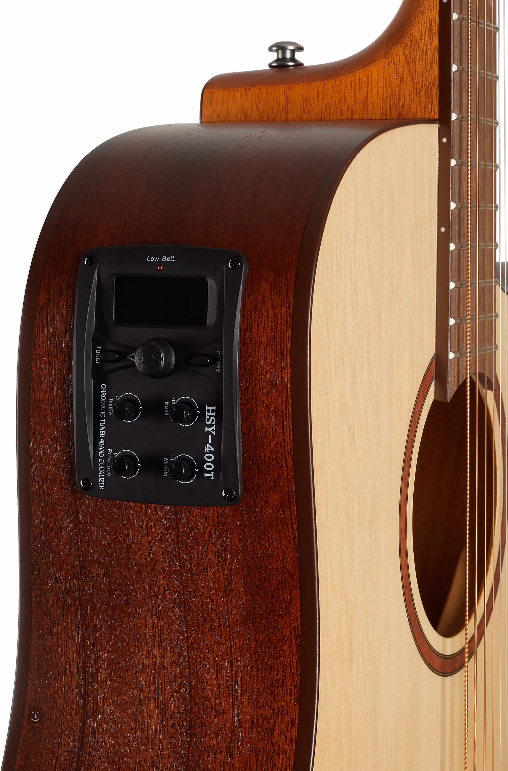 A hangszert egy EQ400T előerősítő hangolja négysávos EQ-val, fázisfunkcióval és beépített hangolóval.