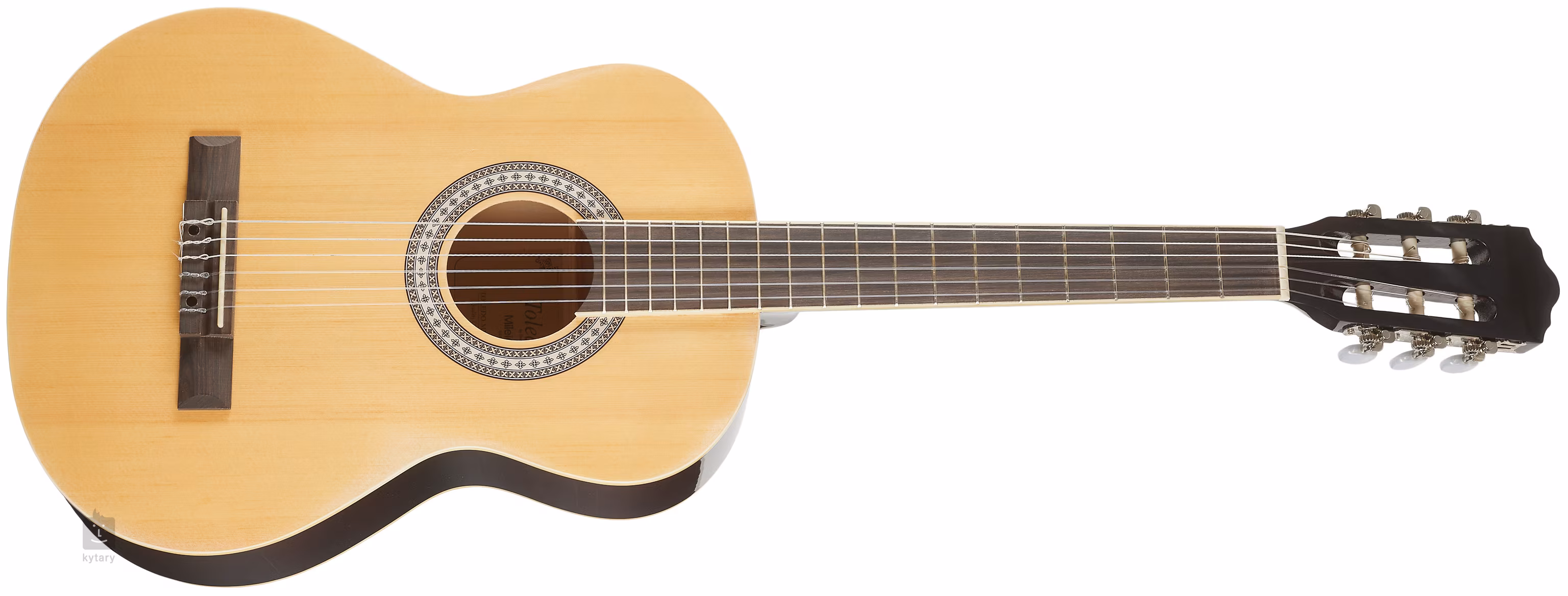 A gyermekgitárok természetesen rövidebb skálával és keskenyebb nyakkal rendelkeznek. A húrokat krómozott hangológépekbe szerelik, gyöngyházmintás hangolószegekkel és feketefa fogólappal. A stílusos kivitelezést a fehér díszítés és a díszes rozetta emeli ki.