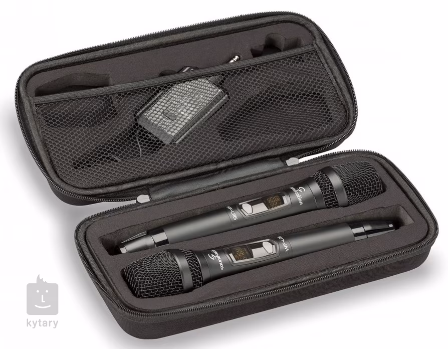 A csomagban két mikrofonos adó, egy belső akkumulátorral ellátott vevőegység és egy tároló tok található.