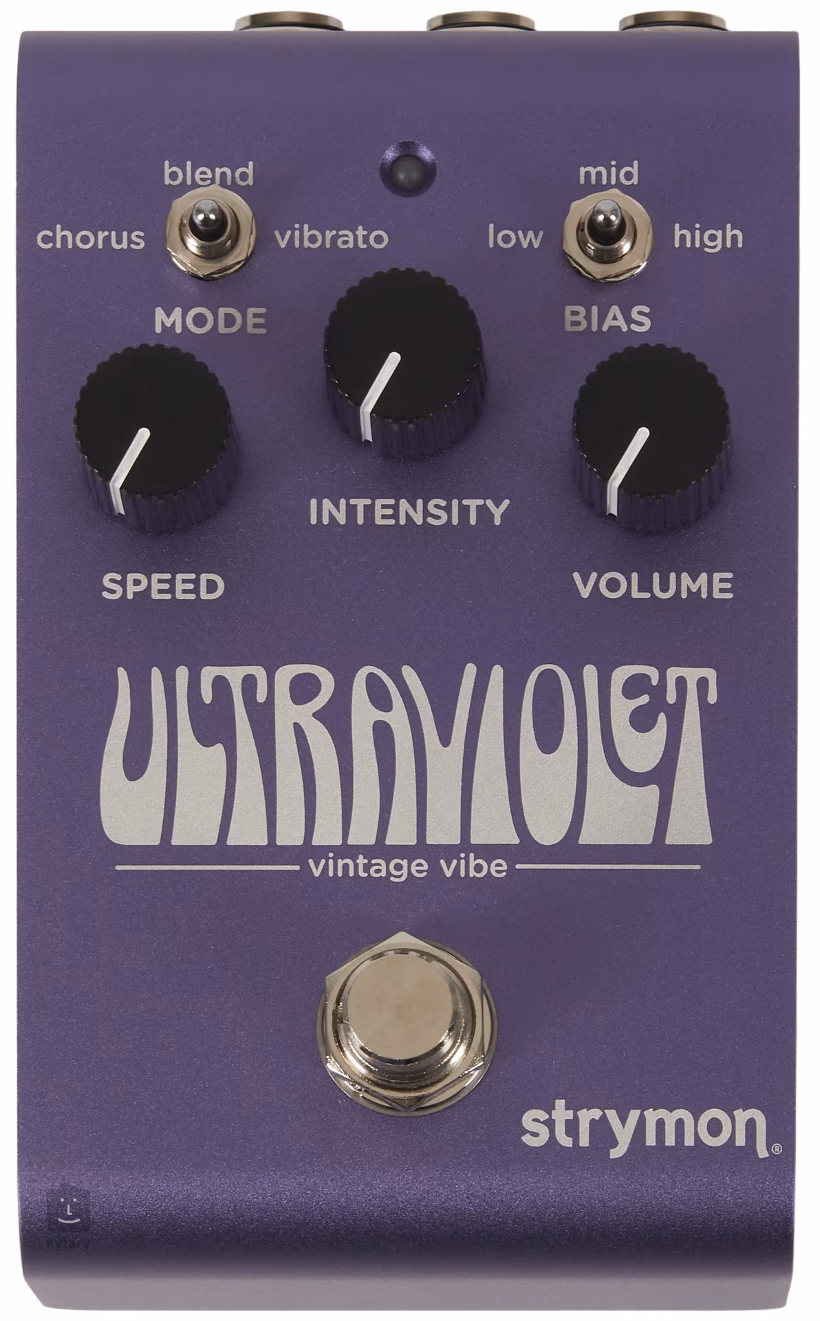 A Strymon UltraViolet szélesebb hangzásválasztékot kínál, mint a hagyományos vibe boxok - a klasszikus Chorus (50% nedves) és Vibrato (100% nedves) beállítások mellett egy új Blend (30% nedves) beállítást is kínál a finomabb modulációs hatások létrehozásához. Három standard szabályozó határozza meg az effektmoduláció sebességét és intenzitását, valamint a kimeneti hangerőt (gain +4 dB-ig). A Bias kapcsoló három moddal változtatja az előfeszítés szintjét, optimalizálja az LFO görbét, felerősít bizonyos frekvenciákat, és így alapvetően megváltoztathatja a hang karakterét.
