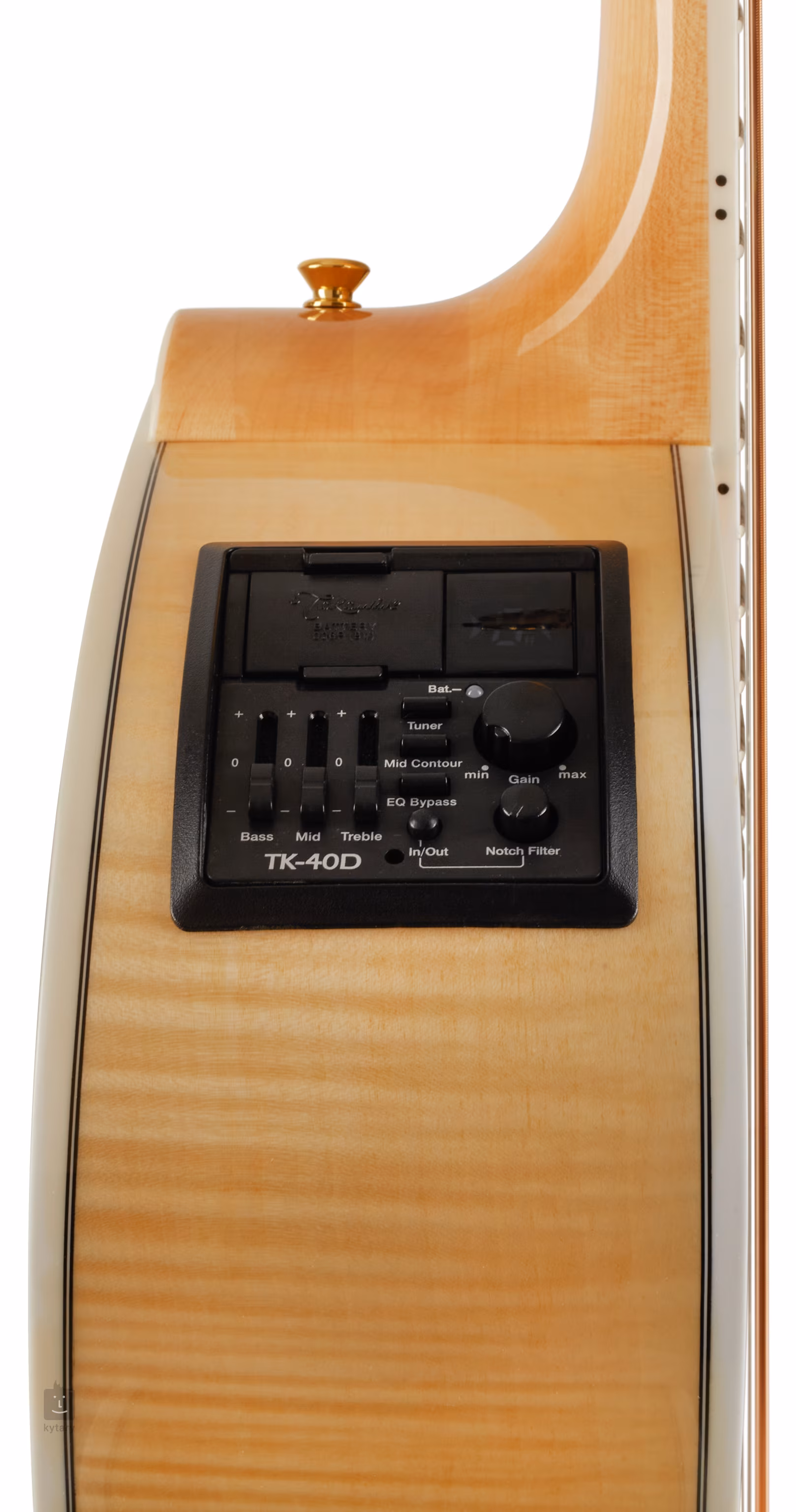 Könnyű hangolási lehetőségeket kínál a Takamine TK-4OD elektronika beépített hangolóval, háromsávos EQ-val, Gain szabályzóval, Notch szűrővel, valamint Mid Contour és EQ Bypass gombokkal.