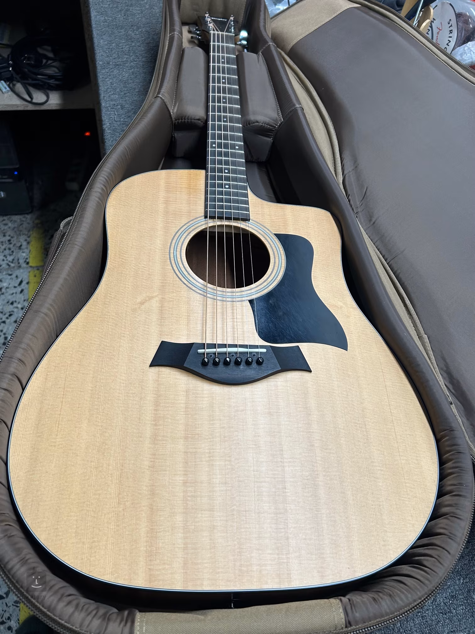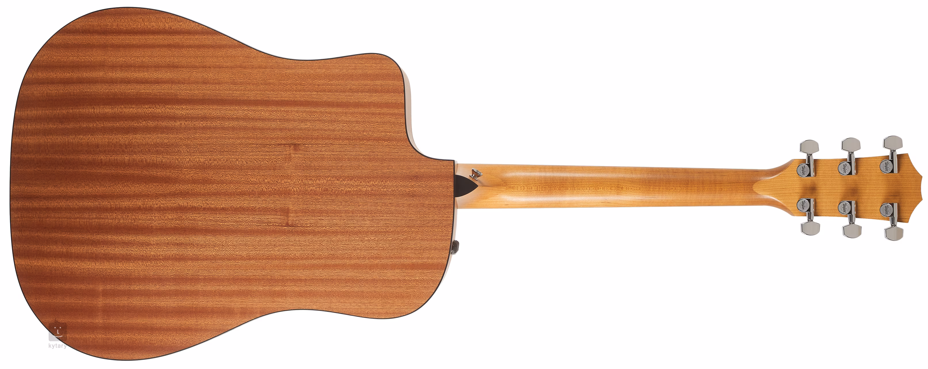 Az amerikai Taylor márka 110ce-S elektroakusztikus gitárja nagy, rezonáns Dreadnought típusú testtel rendelkezik. A gitár elülső fele tömör Sitka fenyőből, a hátsó fele és az oldalak rétegelt sapeléből készültek. A juharfából készült nyakhoz ébenfa fogólap van ragasztva, amelyen húsz fekvő és imitált gyöngyházból készült pozíciós pontok találhatók. A fogólap magasabb pozícióiban a finom, lekerekített alsó kivágás (Venetian Cutaway) megkönnyíti a fogást. A húrok a micarta nyereg és a TusQ anyagból készült nulladik fekvésen keresztül vannak rögzítve a Taylor márkájú krómozott die-cast mechanikákhoz. A szép kivitelezést hagyományos elemek hangsúlyozzák, mint például a három gyűrűből álló rozetta, a fekete testszegély és a praktikus fekete pickguard. A hangot a Taylor Expression System 2 érzékeli. Ez egy teljesen egyedülálló érzékelési módszer, amely a hang realisztikus visszaadásának lehetőségeit eddig soha nem látott dimenziókba emeli. A hangfelvételhez három speciálisan tervezett, független piezoelektromos érzékelőt használnak, amelyek a húrtartó mögött helyezkednek el. A hagyományos érzékelőktől eltérően ezek nem a lap fel-le mozgását érzékelik, hanem a húrtartó nyereg előre-hátra irányuló természetes rezgéseit. Ennek köszönhetően a hang sokkal természetesebb, színesebb és kellemesebb, és jobban reagál a játék dinamikájára. Ugyanakkor az új előerősítőnek köszönhetően a jel 25%-kal erősebb. Természetesen a visszacsatolás is kiküszöbölhető, és a hangerő, a basszus és a magas hangok is beállíthatók. A hangszer hordtáskában (gig bag) kerül forgalomba. A 100-as sorozatú hangszerek a mexikói Tecate-i gyárban készülnek, ami azonban nem csökkenti a minőségüket. Tecate ugyanis csak néhány tíz kilométerre fekszik a kaliforniai EL Cajon-tól, így a gyártás megfelelően ellenőrzött.