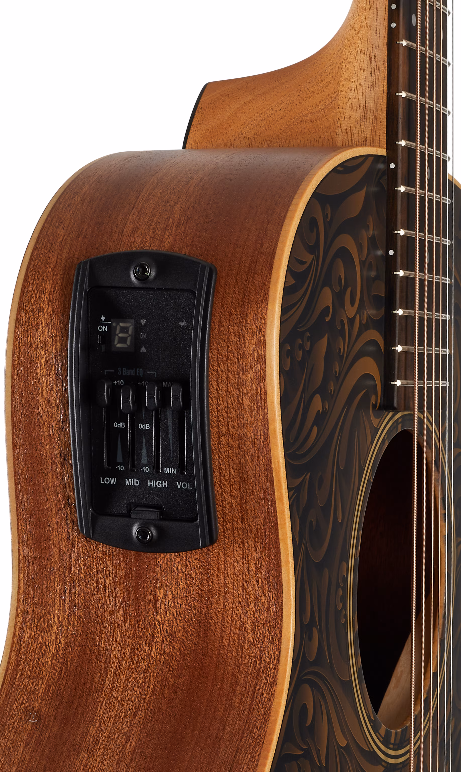 A gitár hangjáról a hangszer hátuljába szerelt ES-B aktív előerősítő gondoskodik, amely a Taylor által kifejlesztett ES-2 rendszeren alapul, amely a hang érzékelésének egyedülálló módja a fogólap mögött elhelyezett három piezo hangszedő segítségével. Az előerősítő háromsávos EQ-val, beépített kromatikus hangolóval és áttekinthető LED kijelzővel rendelkezik.