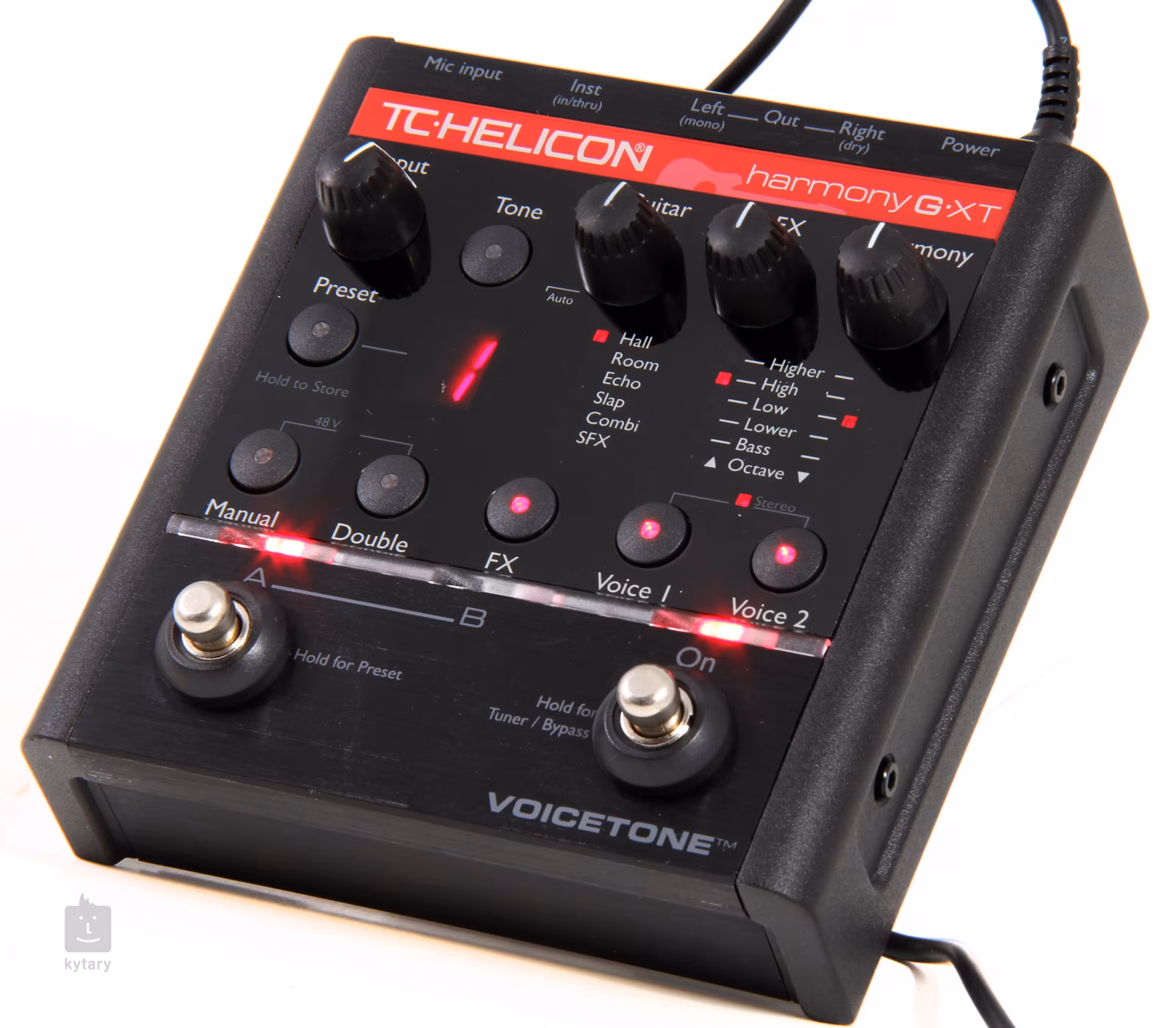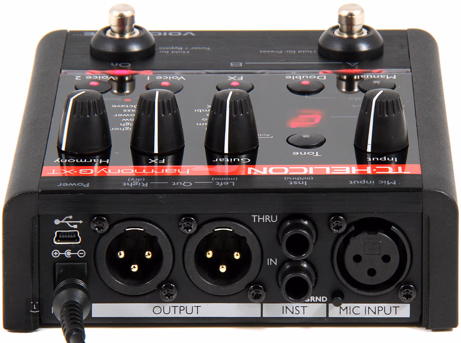 TC-Helicon Harmony-G Vocal Processor XT- harmony arrangement algorithm listens to guitar and voice to follow your music, Improved NaturalPlay - guitar-controlled harmony algorithm, Front-of-house quality reverb algorithm and selection of styles from VoiceLive 2, Selection of four overdub-style doubling effects with two more doubling voices available, Reworked FX presets offer even more utility across music styles, USB connection, Adaptive harmony gate, Easy manual selection of Scale & Key for singers without an instrument or horn players, 18x reverb/delay combinations for vocal and guitar input, 10x presets each with A/B location, selectable harmony voicing including unique bass setting, XLR mic input with 48V phantom power, balanced XLR line output (stereo or left mono/right dry), guitar input and pass-thru for separate amp, guitar tuner, includes external power supply.