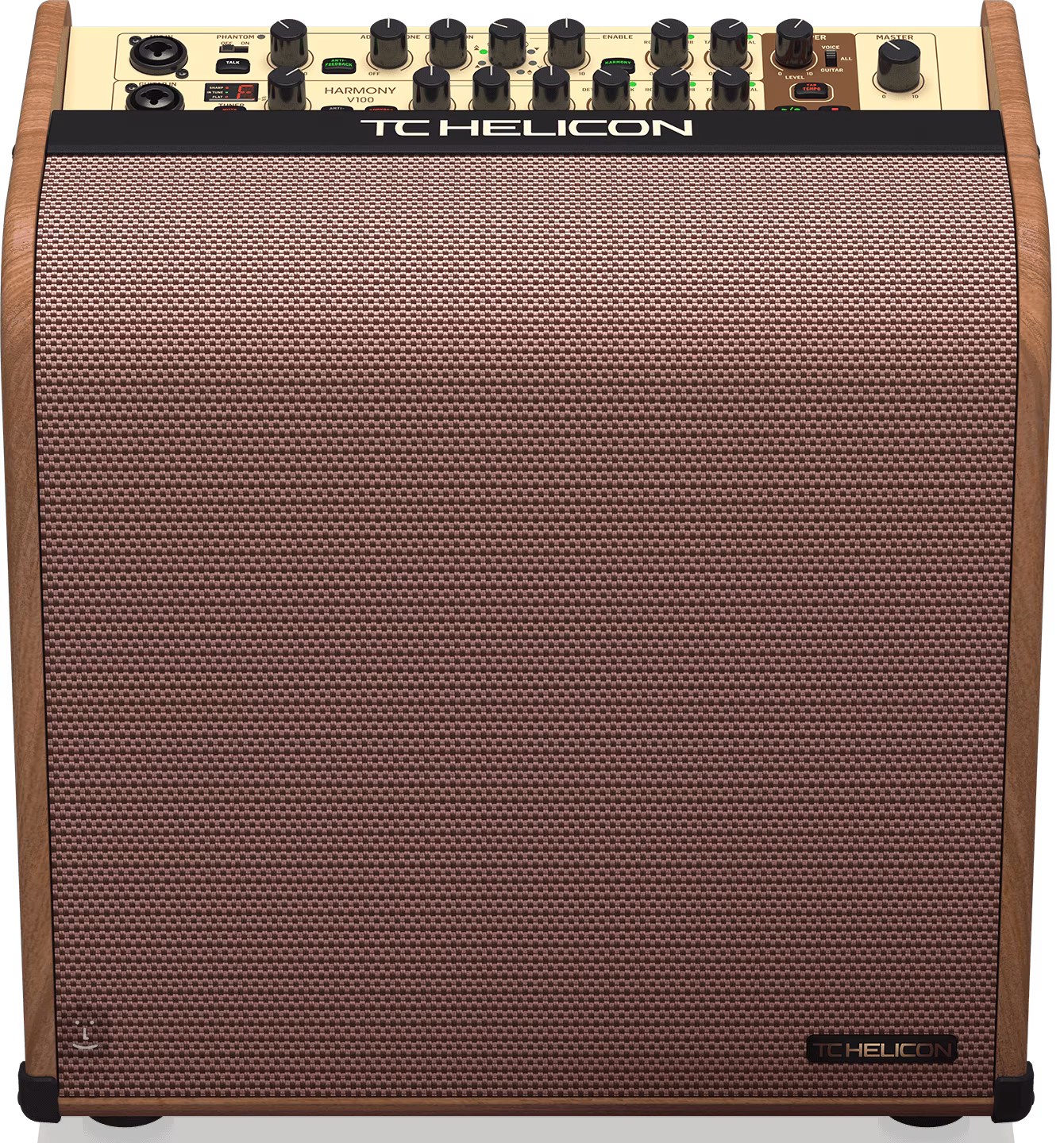 A TC Helicon HARMONY V100 egy kétcsatornás kombo akusztikus hangszerekhez, Class D erősítővel és 100 W teljesítménnyel, vokális processzorral, looperrel, kettős koncentrikus hangszóróval és négycsatornás lábkapcsolóval.