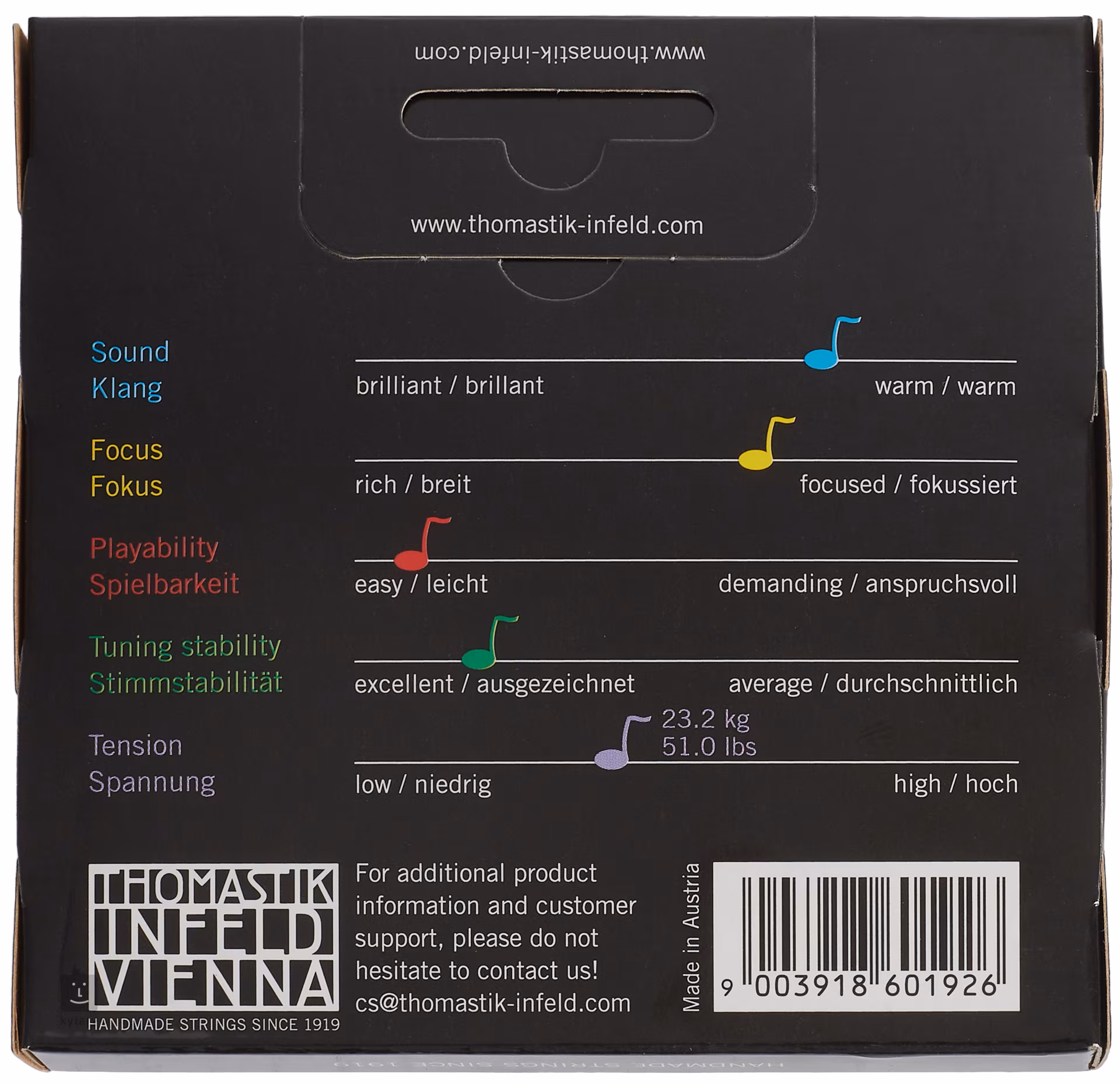 Vision sorozatú hegedűhúrok a legendás Thomastik cégtől. Szintetikus mag jellemzi őket, amely stabil hangolásban jeleskedik. A különböző típusú tekercselések (ónozott acél az E húrnál, alumínium az A és D húrnál és ezüst a G húrnál) kiegyensúlyozott és tiszta hangzást kölcsönöznek a húroknak.