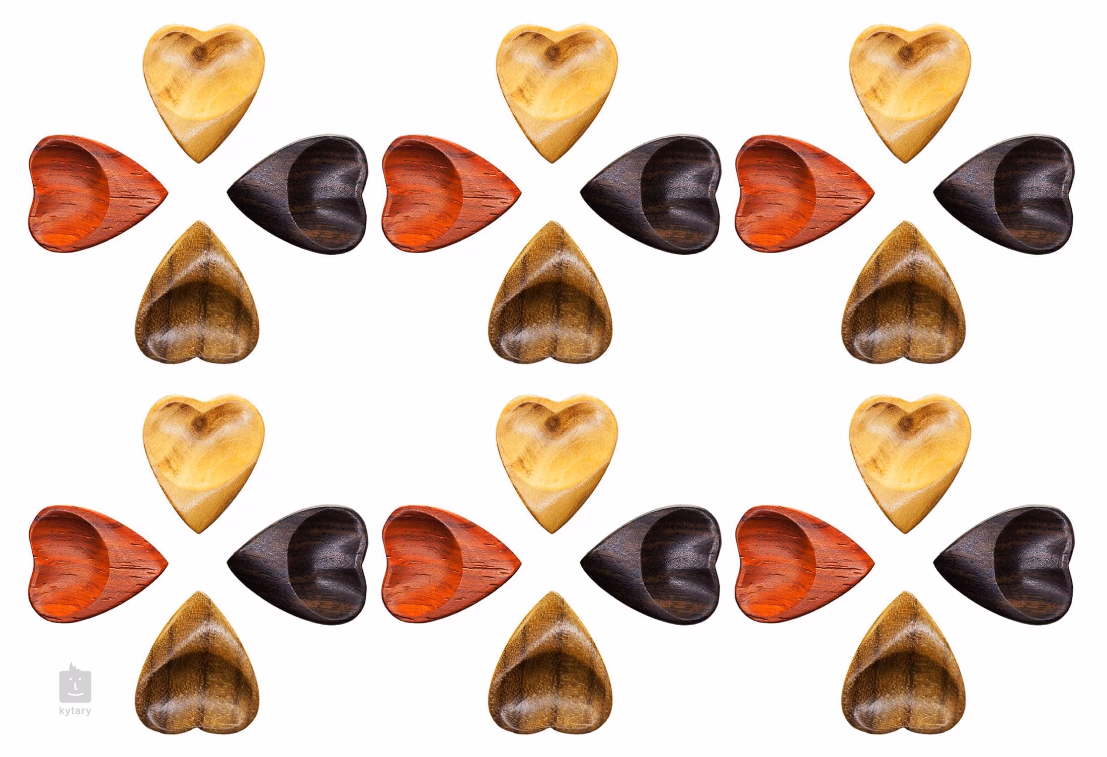 A Heart Tones sorozat szív alakú fa pengetők ideálisak azoknak a játékosoknak, akik éles jazzes élre és szilárd fogásra vágynak. Úgy vannak megformálva, hogy pontosan illeszkedjenek a kézhez, egyik oldalon a hüvelykujjnak, a másik oldalon pedig a mutatóujjnak való mélyedéssel. Ez a készlet húsz pengetőt tartalmaz, amelyek különböző egzotikus fafajtákból készültek. A kemény afrikai ébenfa kiemeli az átütő magasakat, a közepes keményfák, az indiai teak és a haldu frekvenciasemlegesek, a puha padauk pedig meleg, lekerekített hangot eredményez. Egyszóval a különböző hangszínek ideális keveréke az akusztikus és elektromos játékosok számára. Egy praktikus bádogdoboz is jár hozzá.
