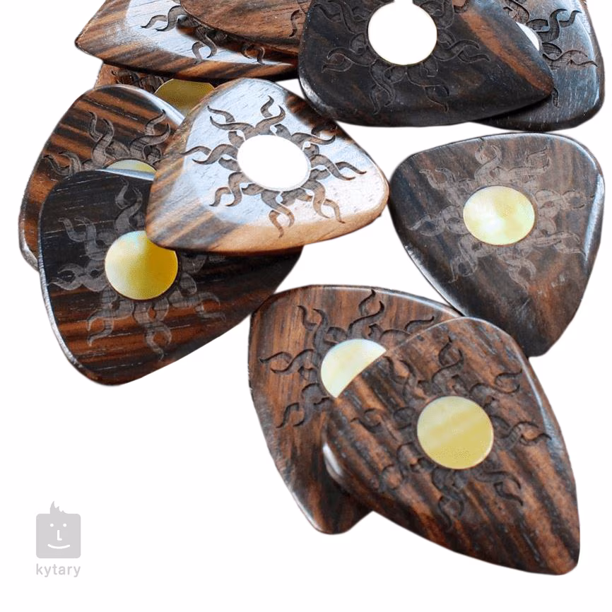 Akár ajándékot keres egy zenekedvelőnek, akár csak a tökéletes hangzást keresi, és szeretné kipróbálni a szokatlan anyagokból készült pengetőket, a Timber Tonesnál biztosan megtalálja, amire szüksége van. A Sun Tones sorozat Timber pengetői egzotikus fákból készülnek, amelyek különböző színű hangokat produkálnak. Ez a modell kemény makassar ébenfából készült, amely átható és tiszta hangot produkál. A fogólap vastagsága 2,5 mm, amely a hegye felé 0,7 mm-re csökken. A lézervágott napmotívum nemcsak stílusos dizájnt, hanem szilárd, csúszásmentes fogást is biztosít.