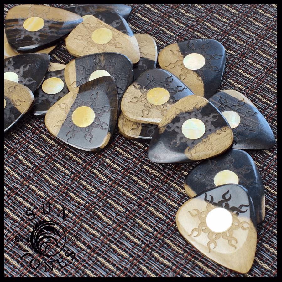 Az egzotikus keményfából készült négy darabos, napmotívumos fa pengetőkészlet különösen alkalmas elektromos vagy oboagitárhoz. Egy praktikus bádogdobozt is tartalmaz.