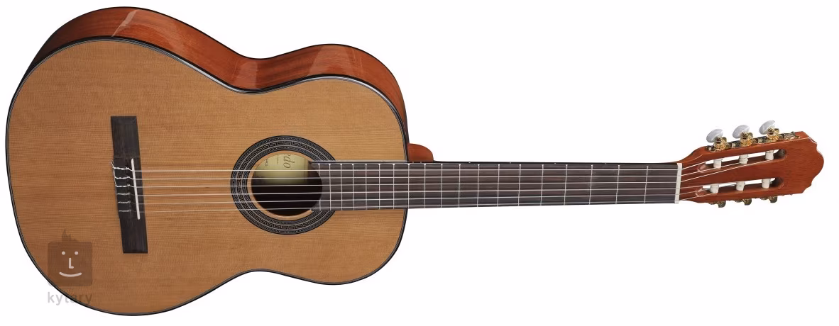 A Toledo Estudio Solida 44CG klasszikus gitár egy megfizethető árú, félig masszív felépítésű hangszer, amely kezdők és tapasztaltabb játékosok számára egyaránt alkalmas. Tömör cédrus hangfal, laminált mahagóni hát- és oldallemez, okoumé nyak, valamint rózsafa fogólap és fogólap jellemzi. A húrokat klasszikus nyitott hangolókarokba szerelték, gyöngyházutánzatú gyöngyházszegekkel. A stílusos kivitelezést a fekete és fehér vonalakkal kiegészített fekete peremkötés, a díszes rozetta és a fényes fényezés emeli ki.