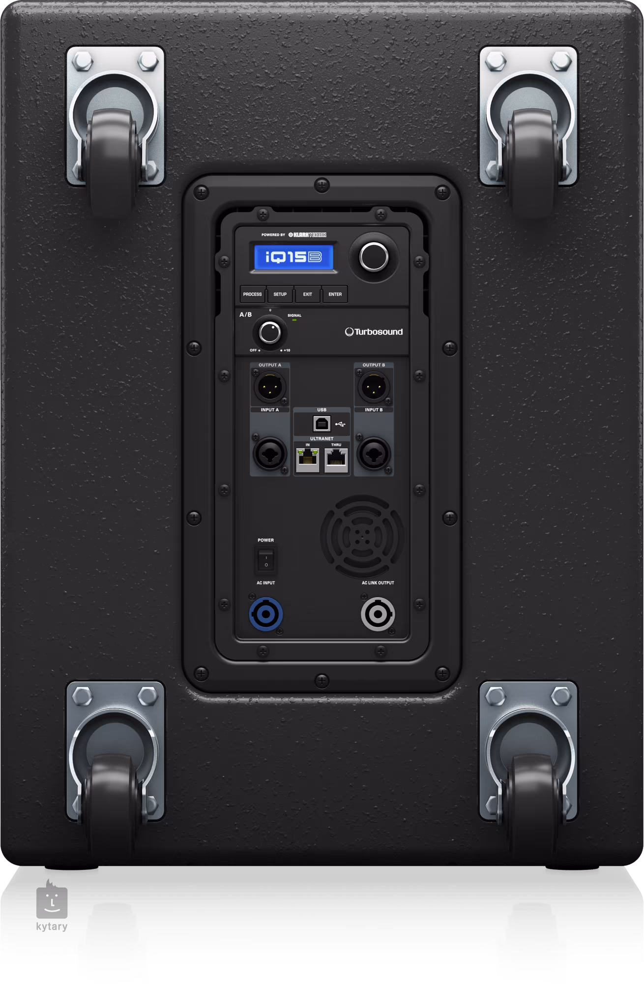 A Turbosound iQ15B aktív mélysugárzó 3000 W maximális teljesítményű Klark Teknik D osztályú erősítővel, 15 hüvelykes meghajtó 4 hüvelykes hangtekerccsel és dupla felfüggesztéssel, Klark Teknik digitális processzorral, 40 Hz - 130 Hz (-10 dB) frekvenciatartomány, maximális hangnyomás 130 dB, A és B csatorna szintszabályozás, forgatógomb az előbeállításokhoz való hozzáféréshez, equalizer, Speaker modellezés és Feedback Control (FBI), két kombinált jack/XLR bemenet, XLR kimenetek az A és B csatornákhoz, Ultranet csatlakozók (2x RJ45) az Ultranet csatlakozással rendelkező konzolokhoz és digitális keverőkhöz való csatlakozáshoz és USB port (távvezérlés PC-ről, firmware frissítés).