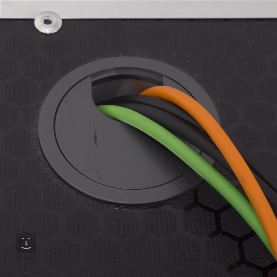 A DJ asztal lekerekített sarkokkal, huzalozási nyílással és párnázott gumibetétekkel rendelkezik. A rendkívül tartós szerkezet 9 mm-es rétegelt lemezből készült, laminált hatszögletű kivitelben és extra széles alumíniumprofilokból.