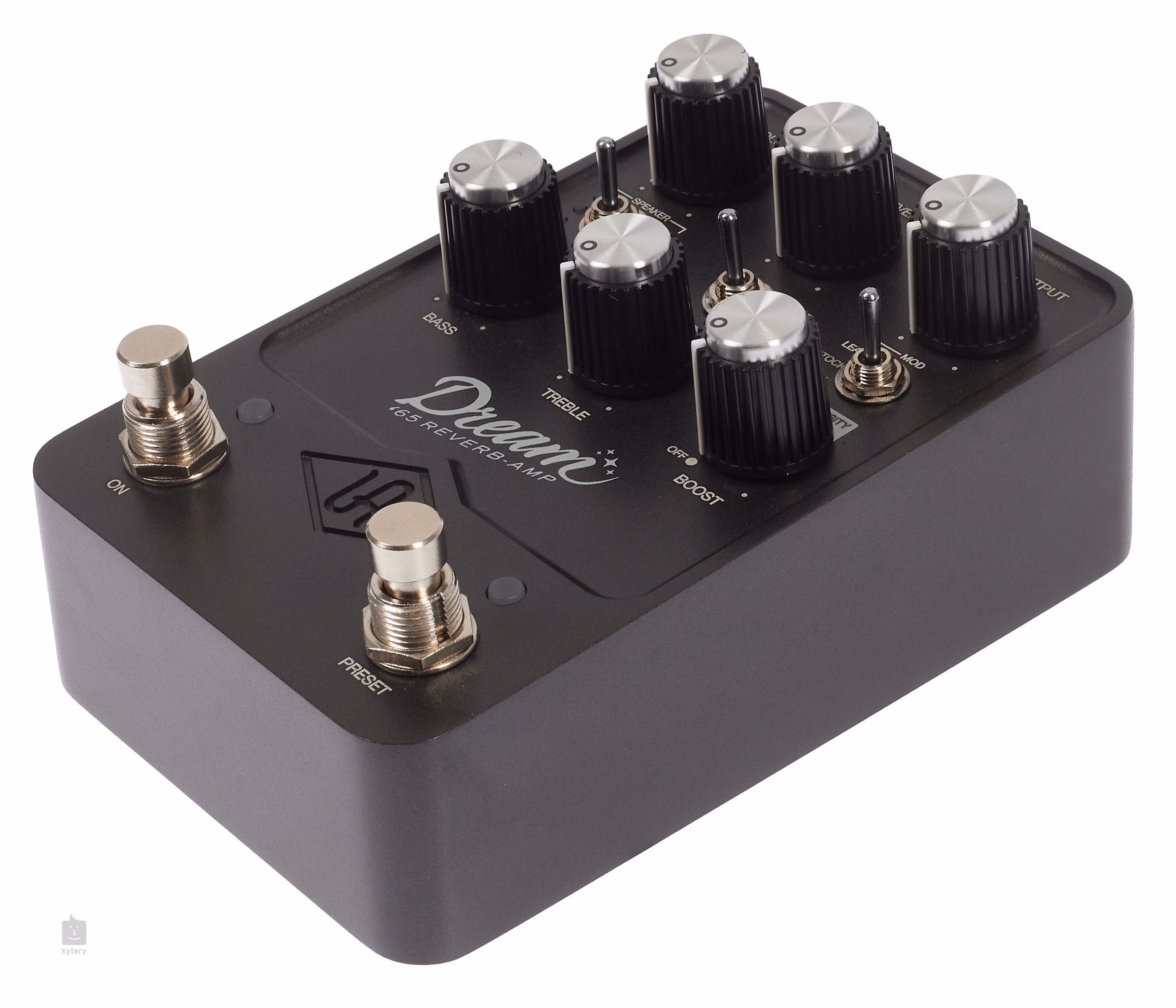 Az UAFX Dream '65 Reverb Amplifier egy sztereó pedál, amely a legendás '65-ös Fender Deluxe Reverb gitárerősítőt emulálja, választható hangszóróval (akár 6 típus), három boost előerősítő áramkörrel, rugós reverb, vibrato effekt és további testreszabási lehetőségekkel a mobil alkalmazáson keresztül. Minimalizálja élő gitárfelszerelését, ha a Dream '65 effektet a pedállapon használja valódi erősítő helyett, vagy rögzítse a kész hangzást közvetlenül a DAW-ba.
