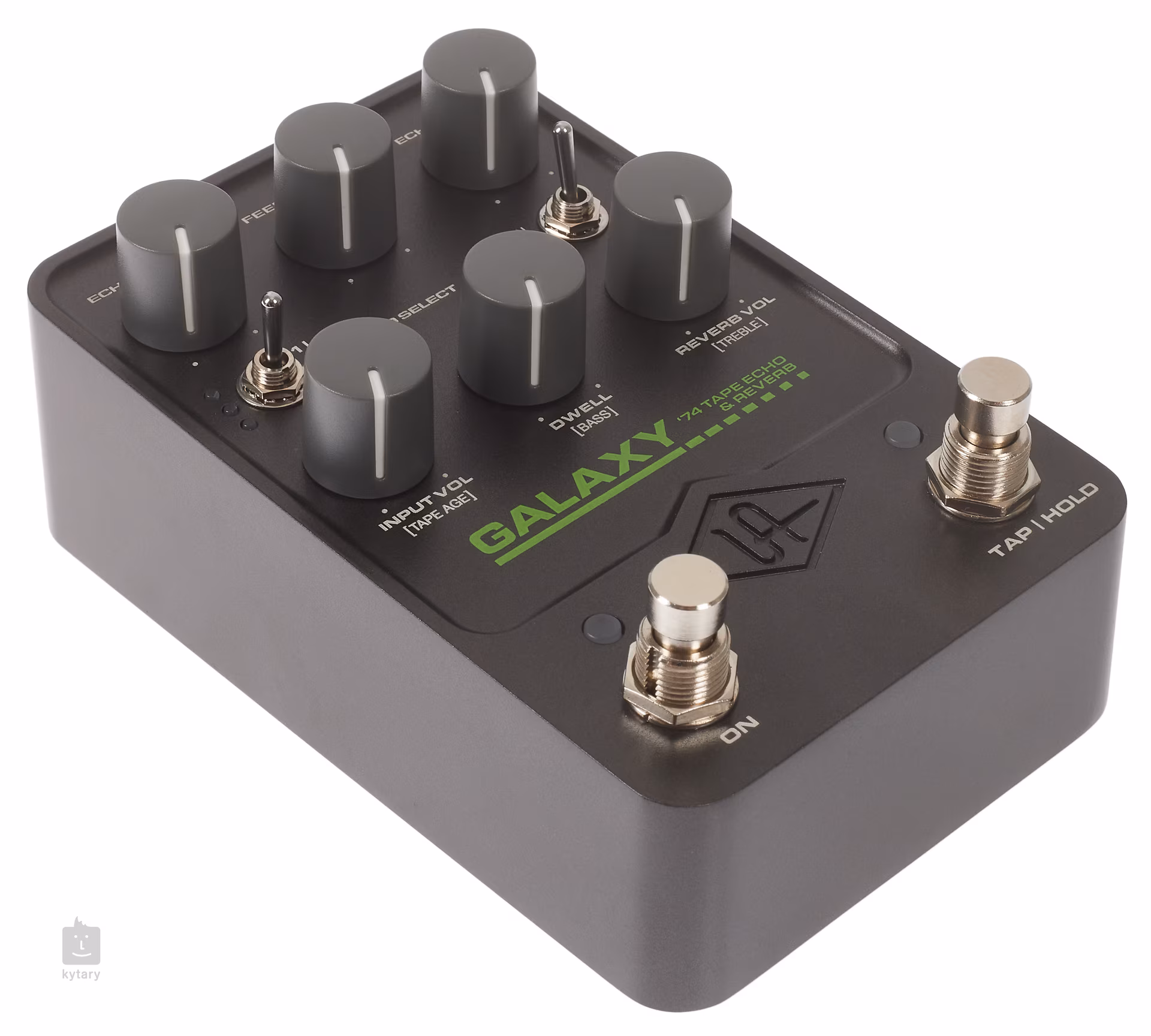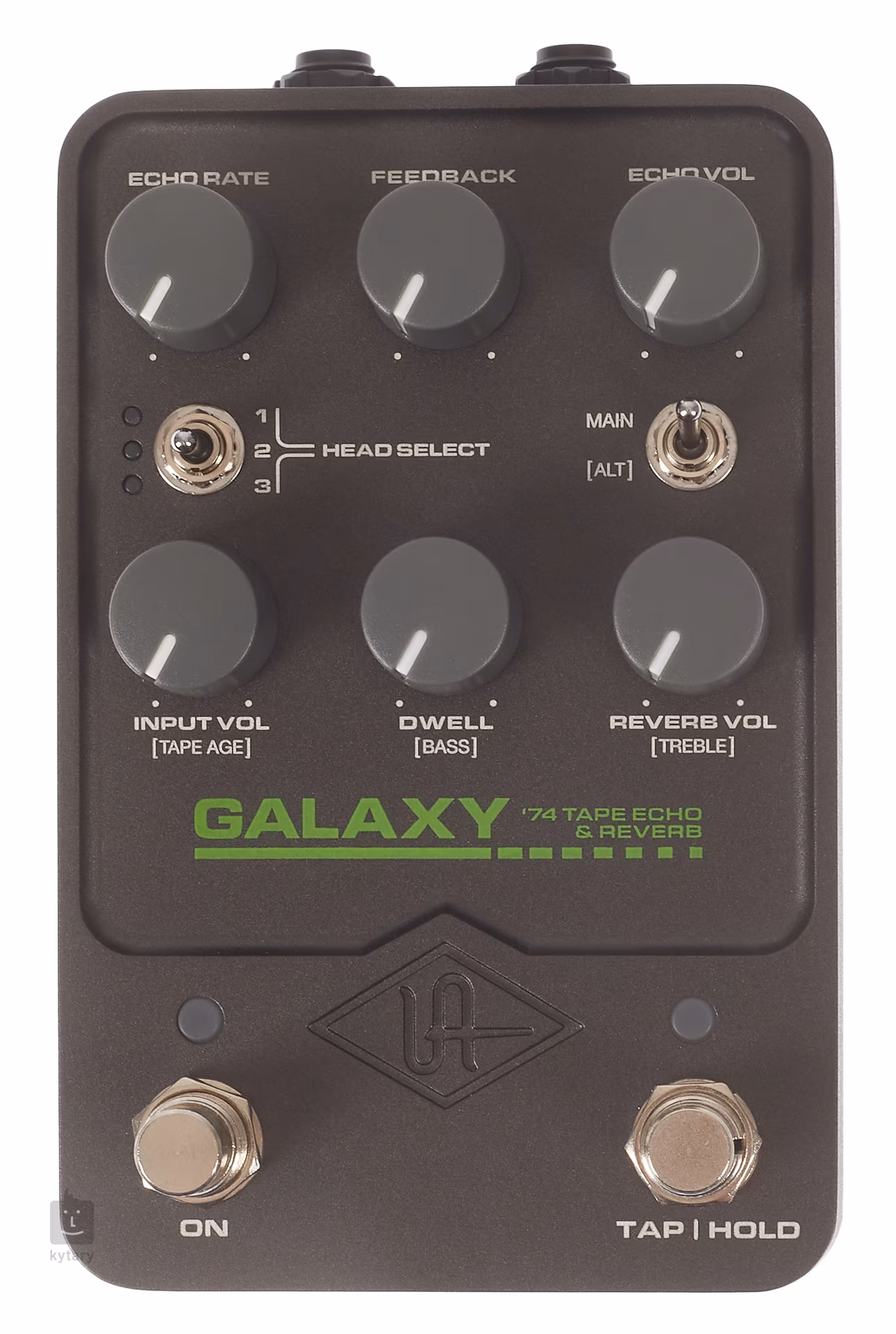 A Universal Audio Galaxy '74 Tape Echo & Reverb egy 2 az 1-ben pedálhatás, amely vintage szalagos visszhangot és rugós visszhangot kombinál. A doboz három szalagos visszhangfej kombinációt, virtuális magnószalag öregedésének/kopásának beállítását, a rugós visszhang karakterének beállítására szolgáló Dwell vezérlőt, kétcsatornás ekvalizert, valamint Tap Tempo és Hold funkciókat kínál. Mindezt egyszerűen beállíthatja a vezérlők és kapcsolók segítségével – nincs szükség a presetek között való böngészésre.