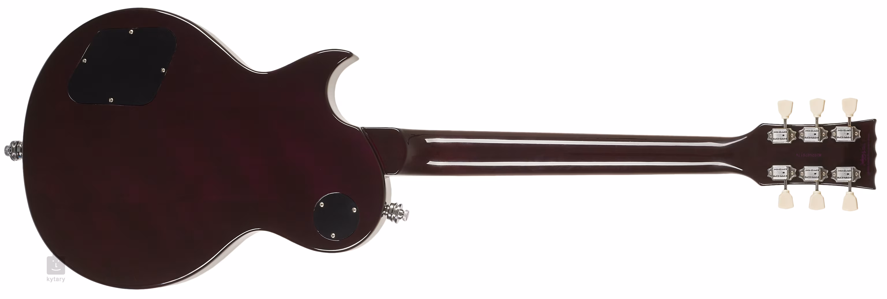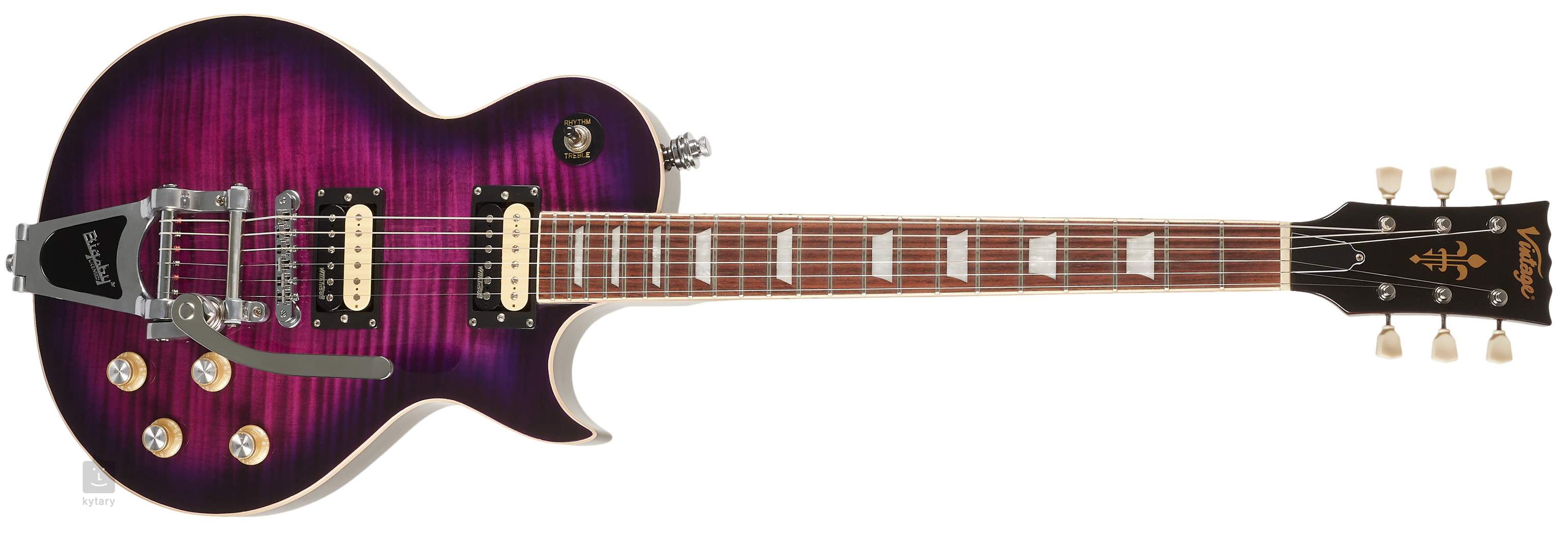 Elektromos gitár V100 GUITAR - PURPLE FLAMED MAPLE WITH BIGSBY single-cut LP kivitelben a népszerű VIntage Reissued sorozat része. A hangszer mahagóni testét juharfából készült tető és látványos, lángolt juhar furnér díszíti, amelynek famintázatát a színes kivitel támogatja. A huszonkét közepes méretű bunddal ellátott rózsafa fogólap egy kellemes "Soft C" profillal rendelkező mahagóni nyakhoz van ragasztva. A fogólap felületén való tájékozódást a pozíciós blokkok segítik.